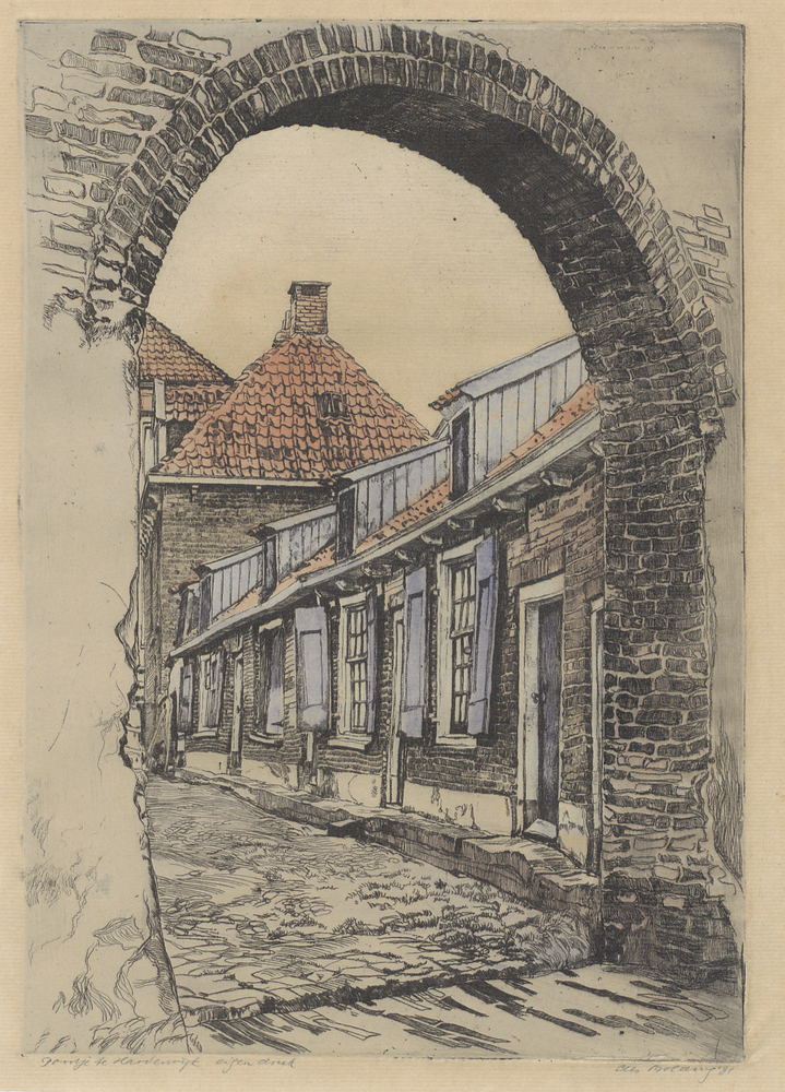 Ets, ingekleurd, getiteld 'Poortje te Harderwijk', d...