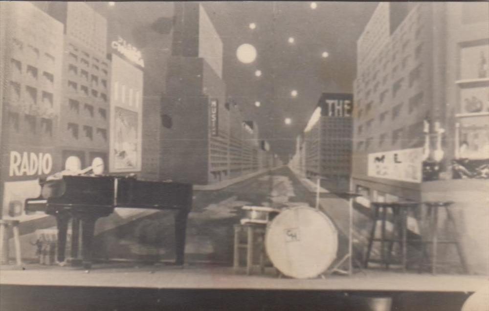 Foto van een podium met een decor van een stad en bar.
