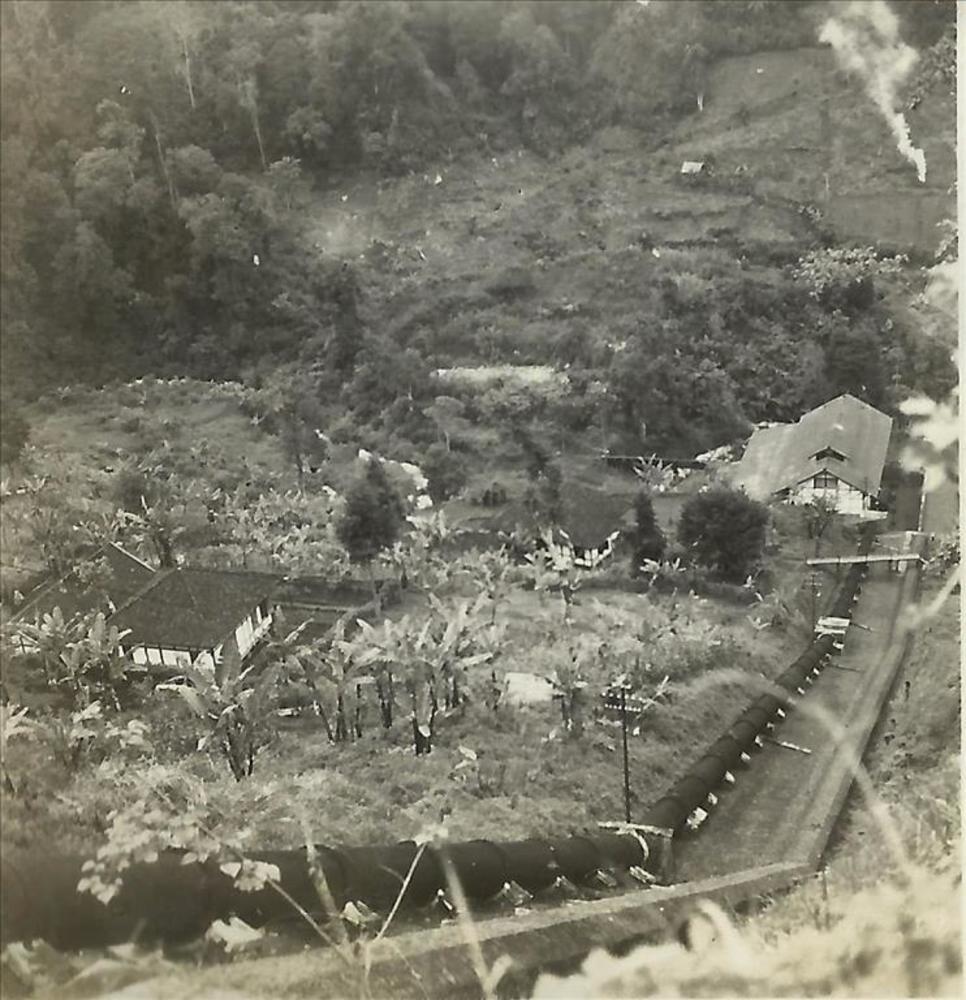 Nederlands Indië; pijpleiding, pompstation, huisjes,dal
