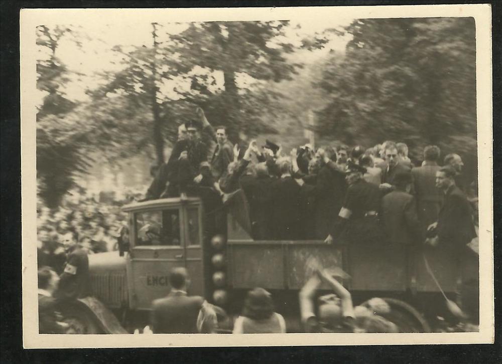 Intocht Duitse troepen. Links brengen burgers Hitler...