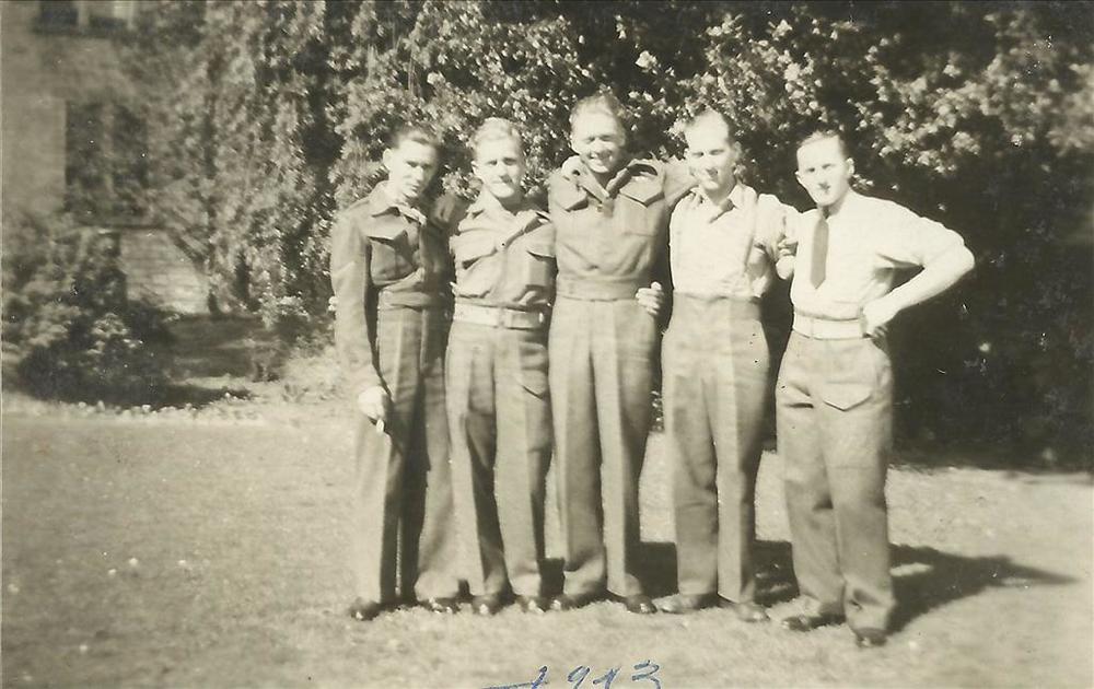 vijf Canadese militairen in tuin