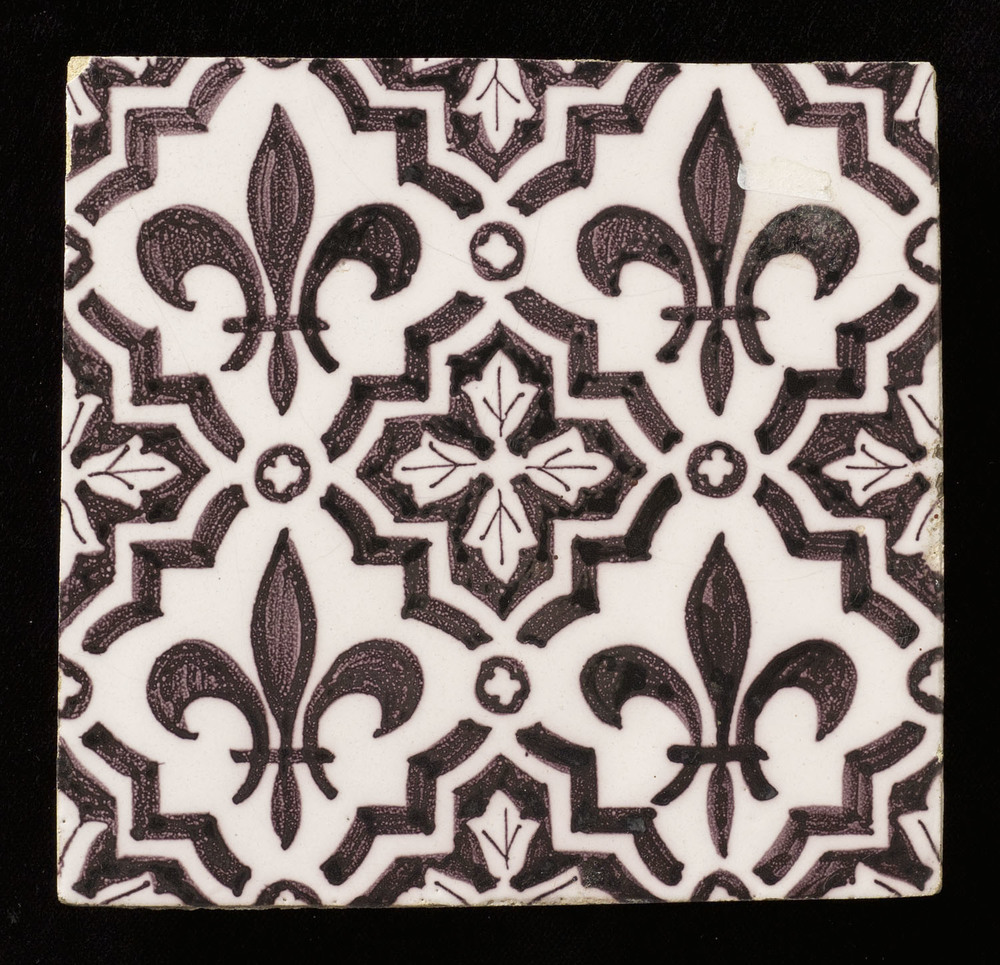 Tegel in tinglazuur, voorstellende ornament met leli...