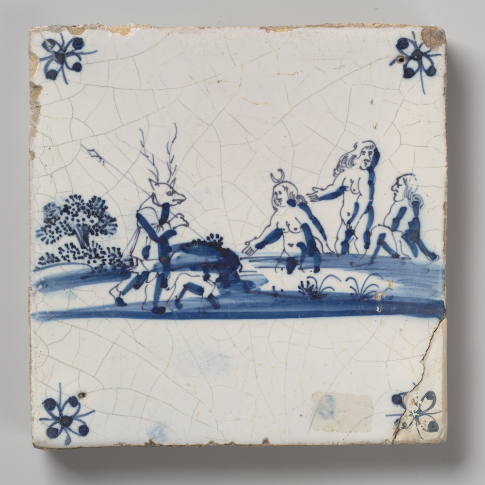 tegel van aardewerk met tinglazuur, voorstellende: b...