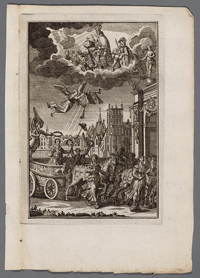 Gelauwerde man in quadriga, boven hem een bazuinende...