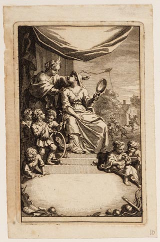 Putti in een hof, daarboven houden putti een kroon b...