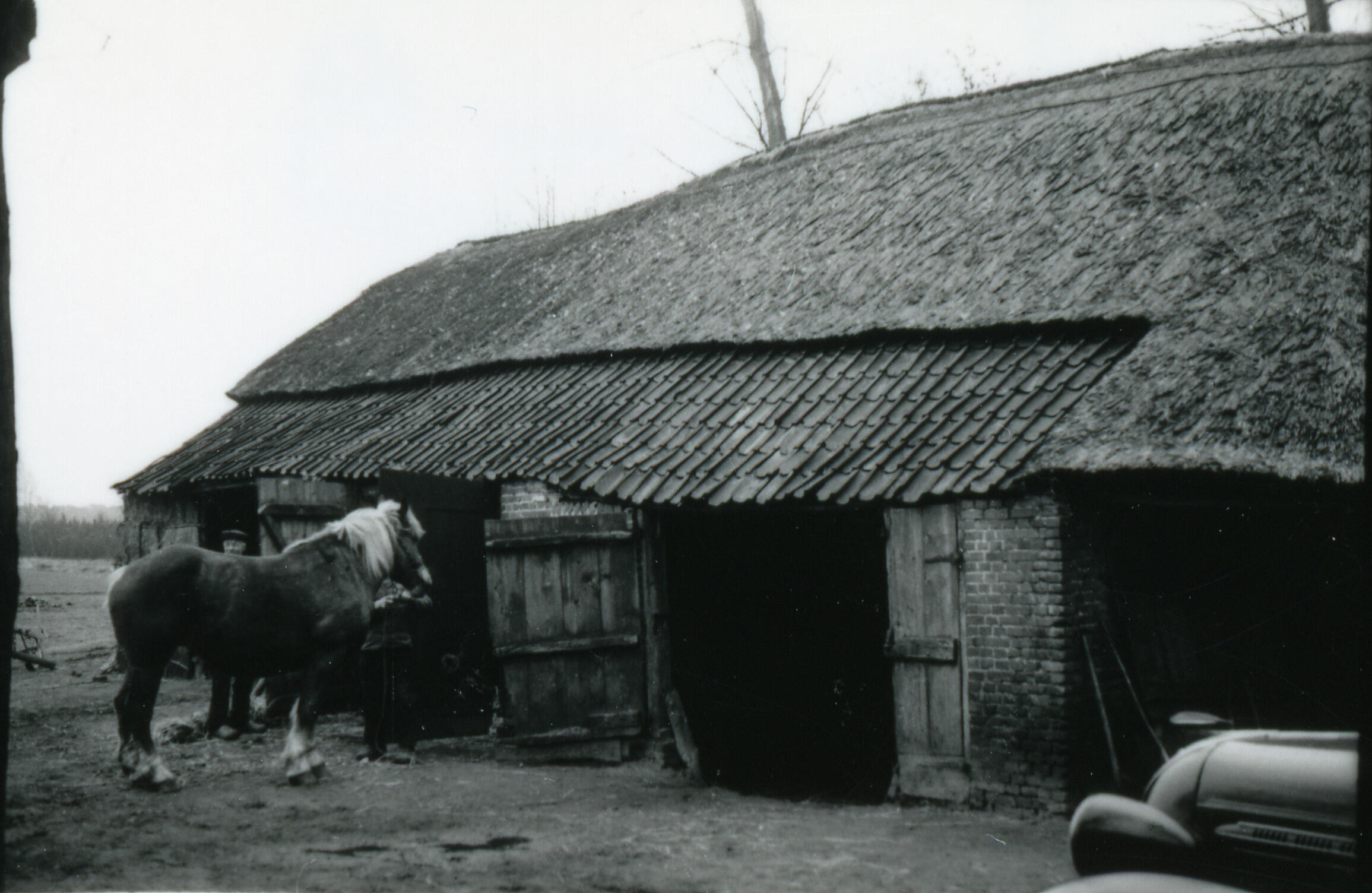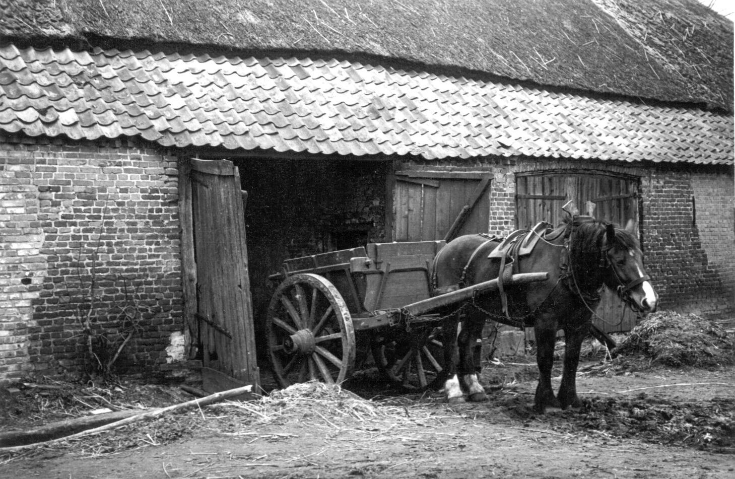 Paard bij een boerderij, Deurne, 1939 (zwart-wit foto)