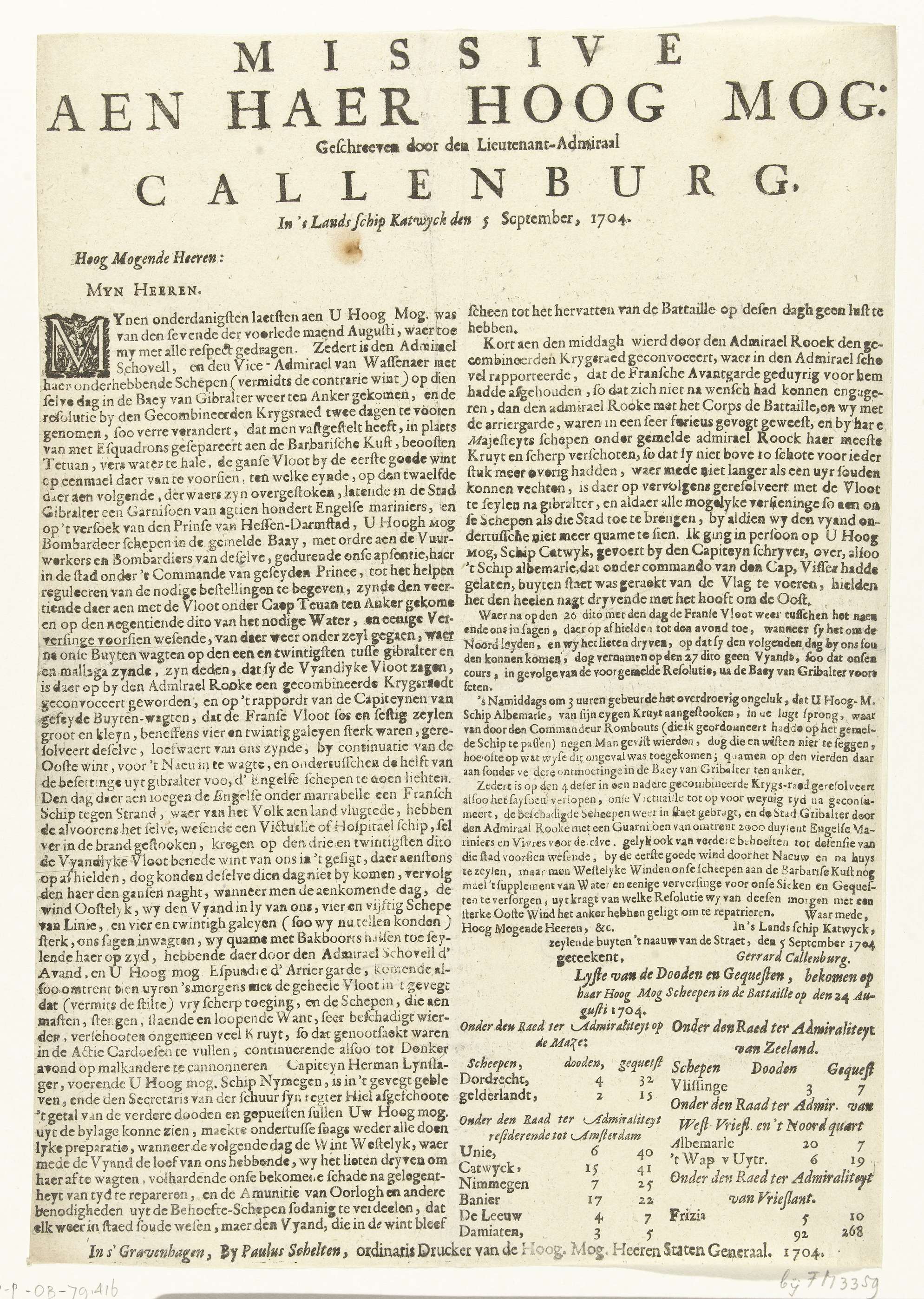 Brief over het verloop van de zeeslag bij Malaga, 1704