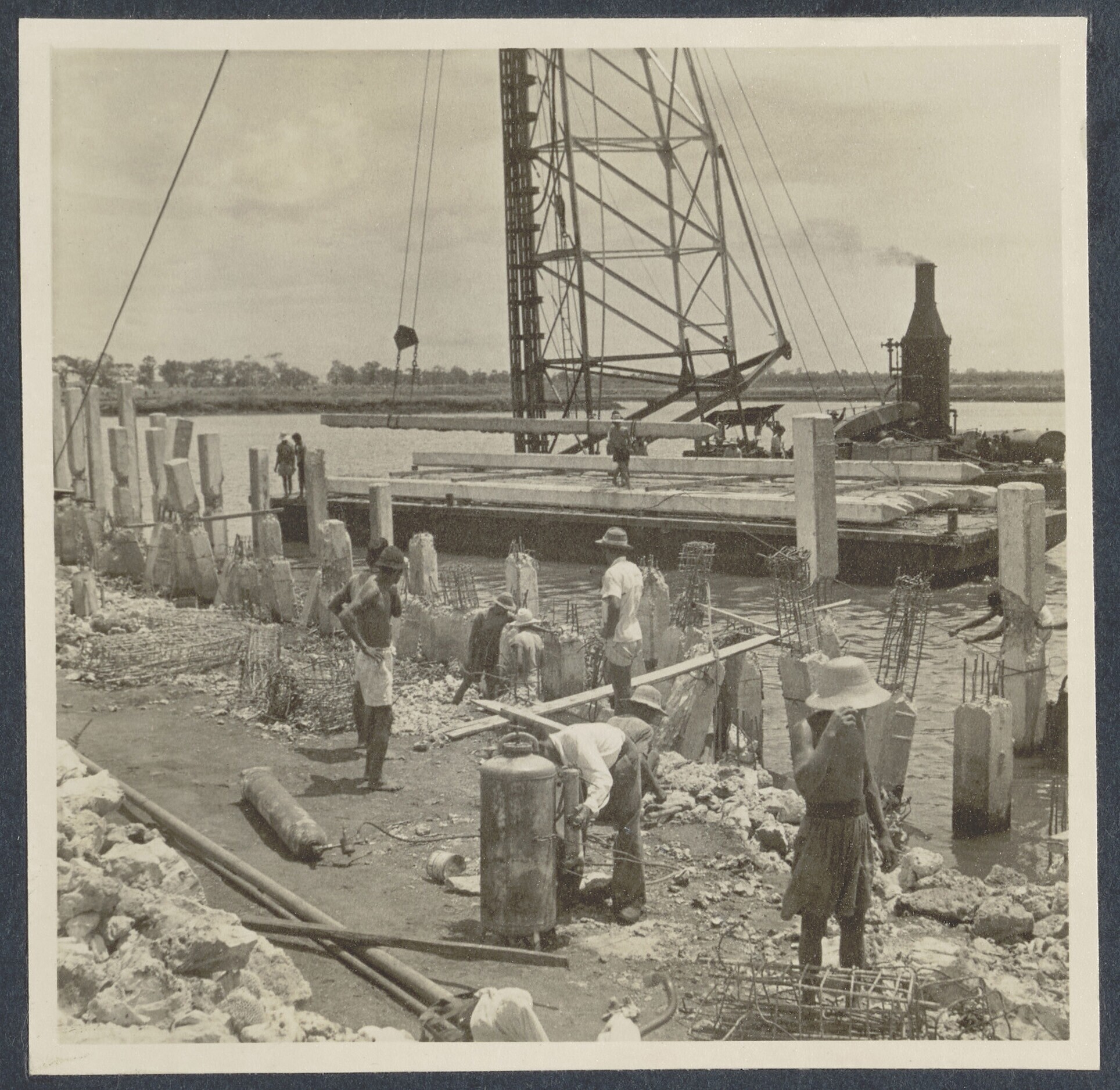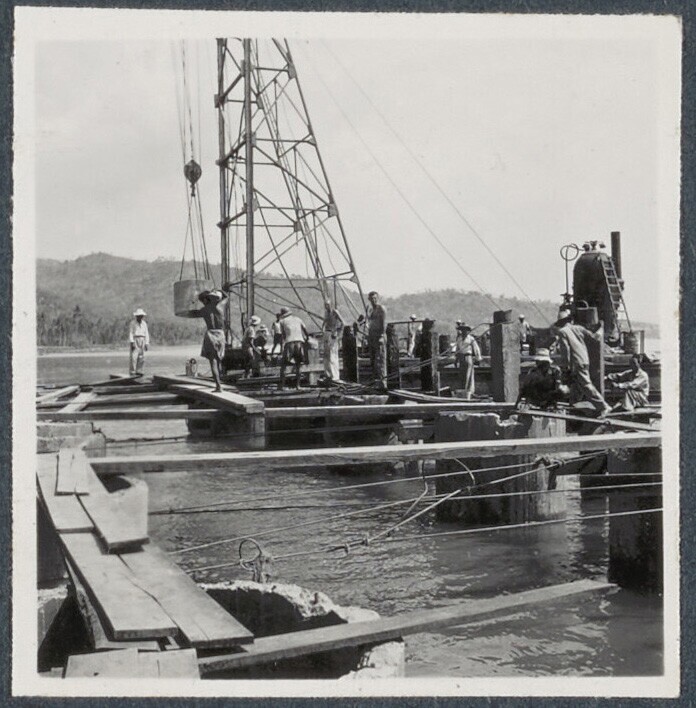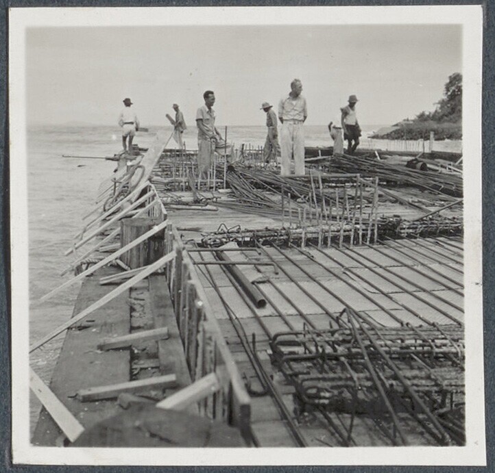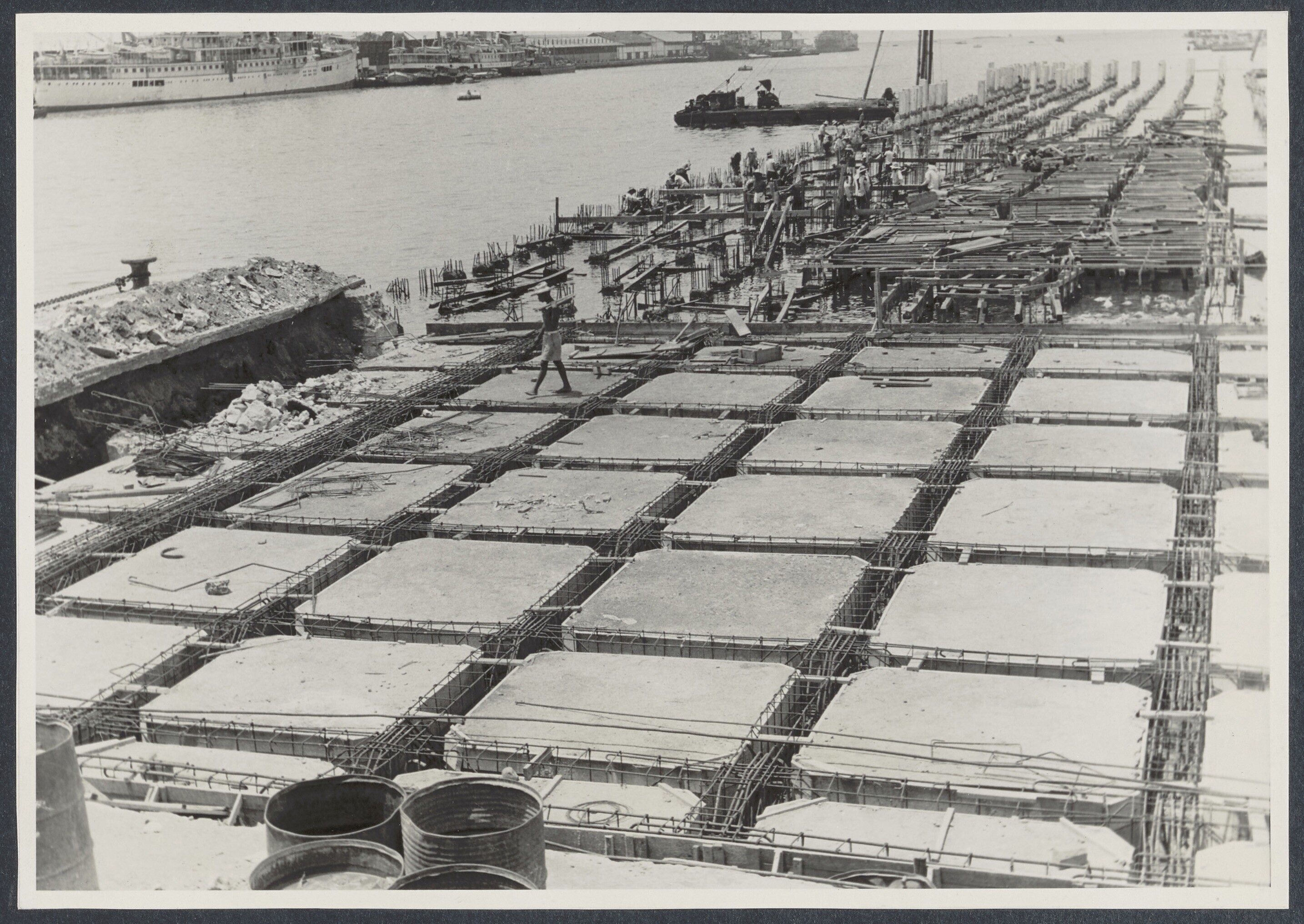 Betonwerkers bij de eerste diepzee-kadebouw van Indo...