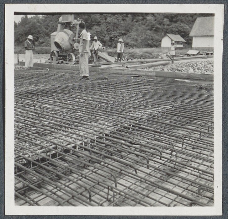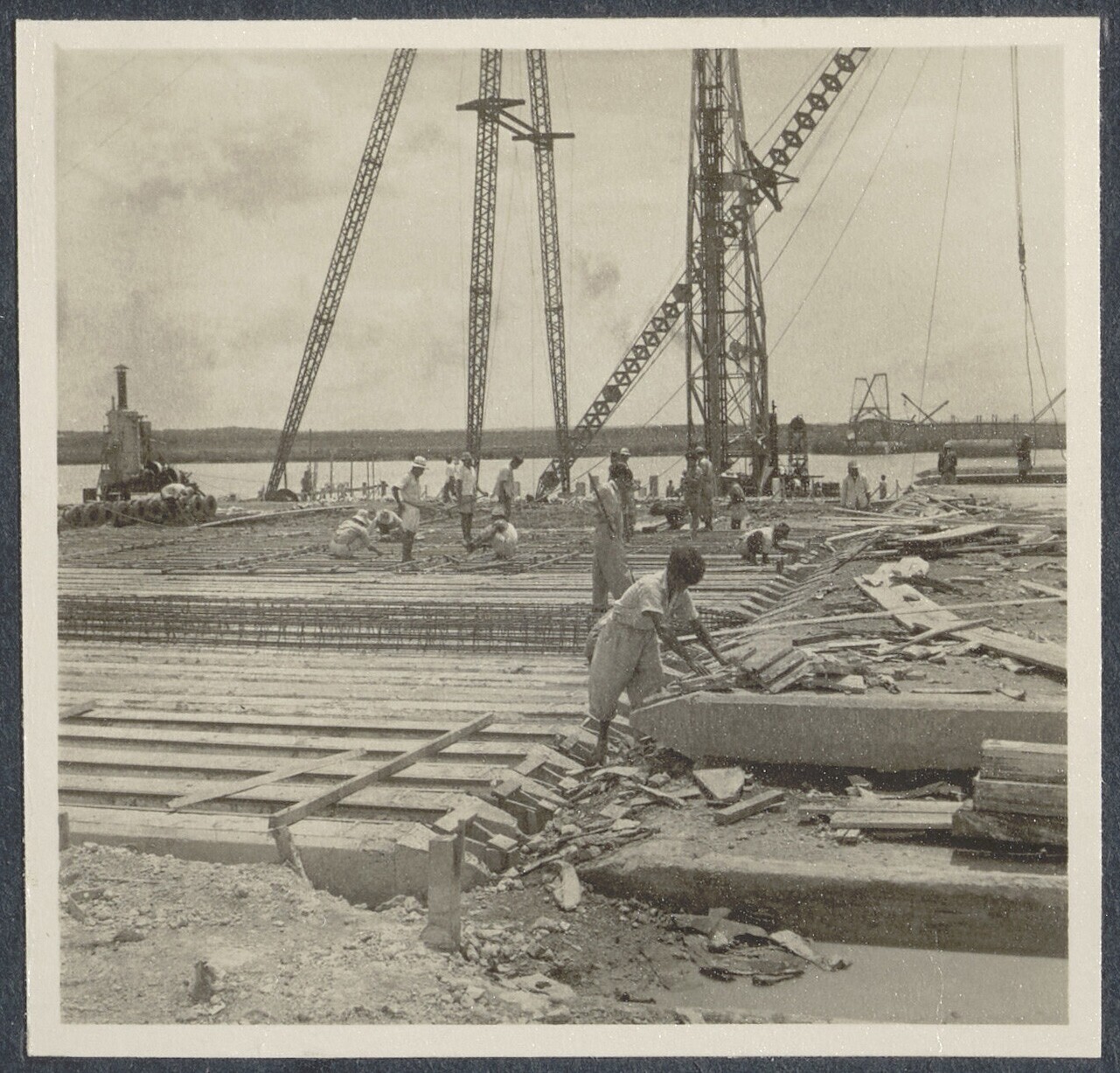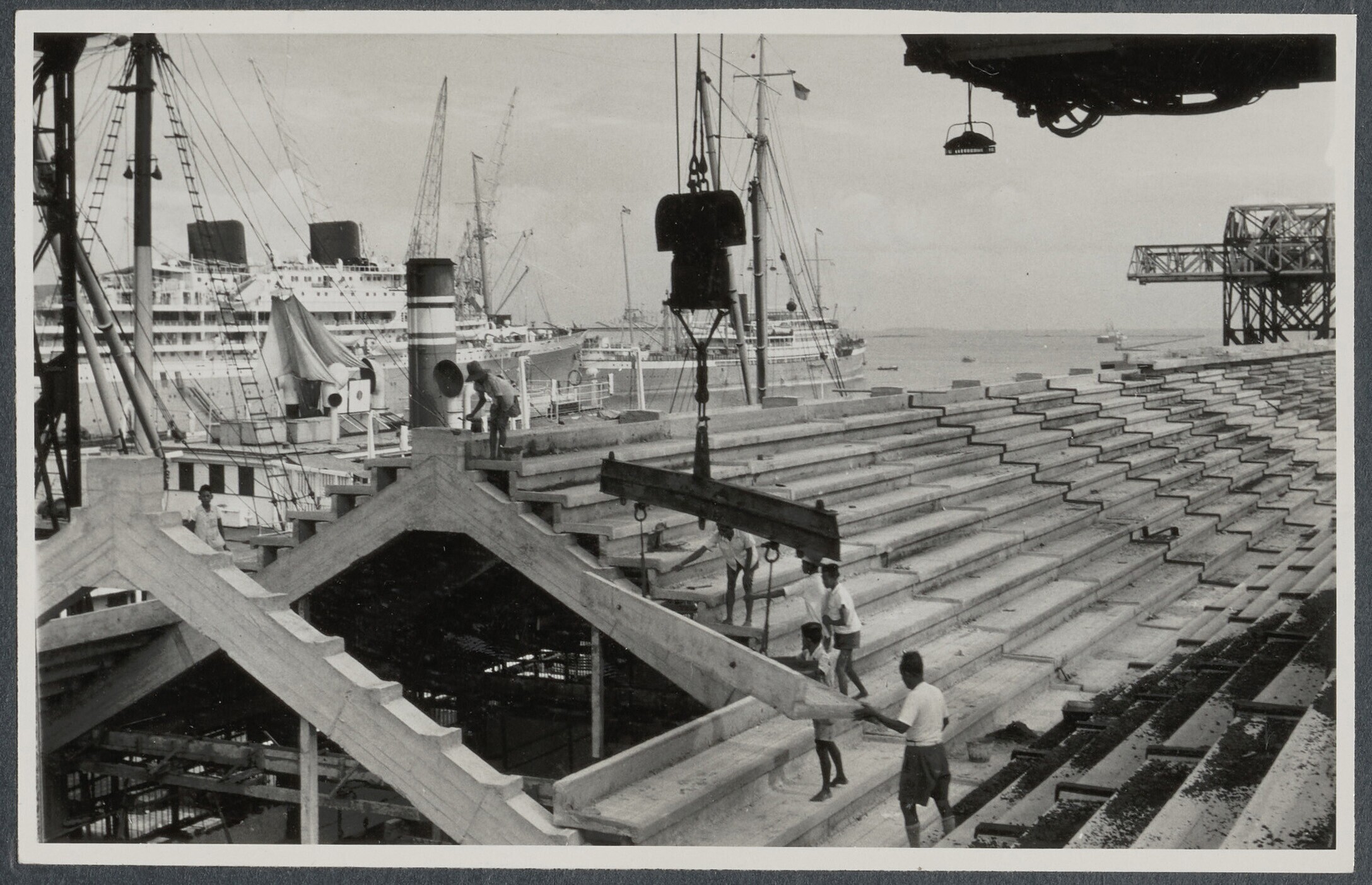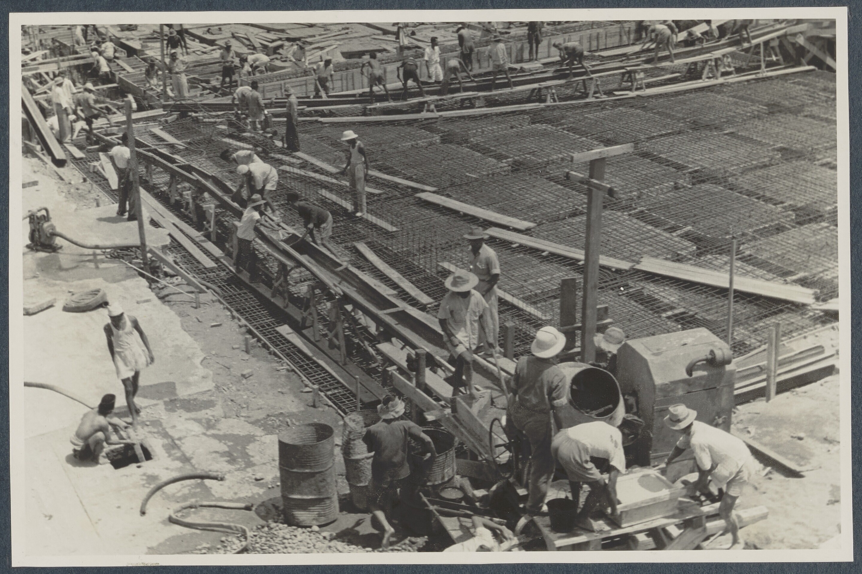 Betonwerkers bij de eerste diepzee-kadebouw van Indo...