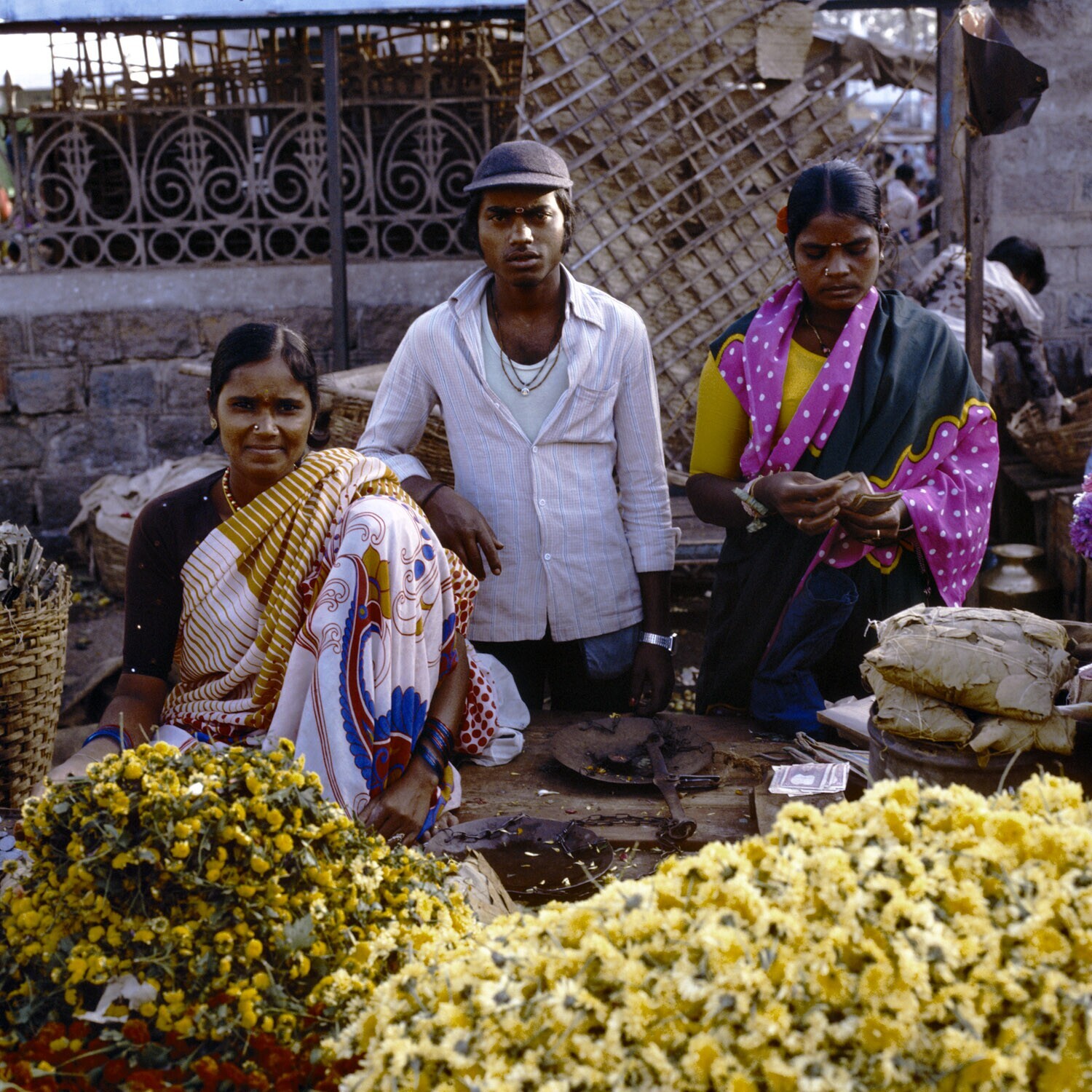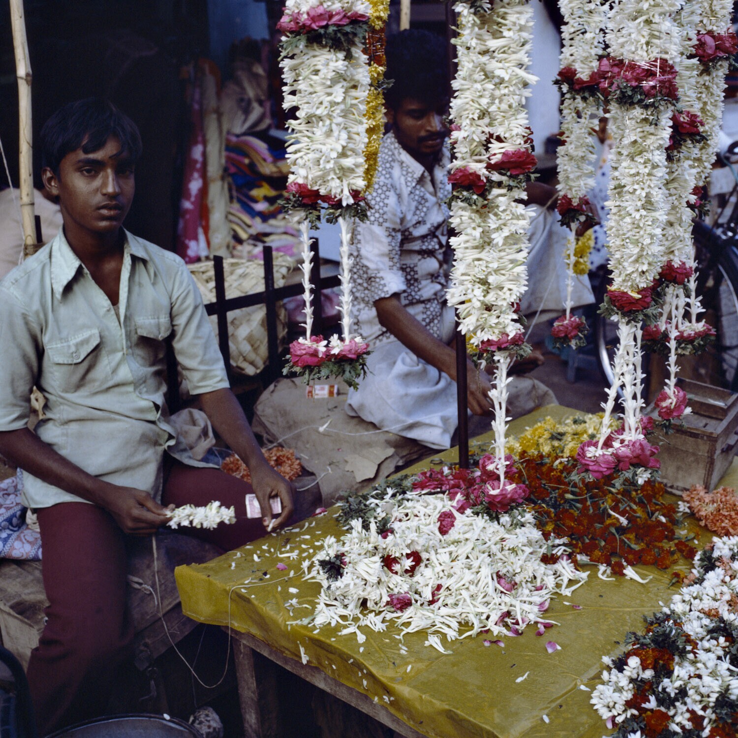Een bloemenverkoper uit New Delhi op de markt in de ...