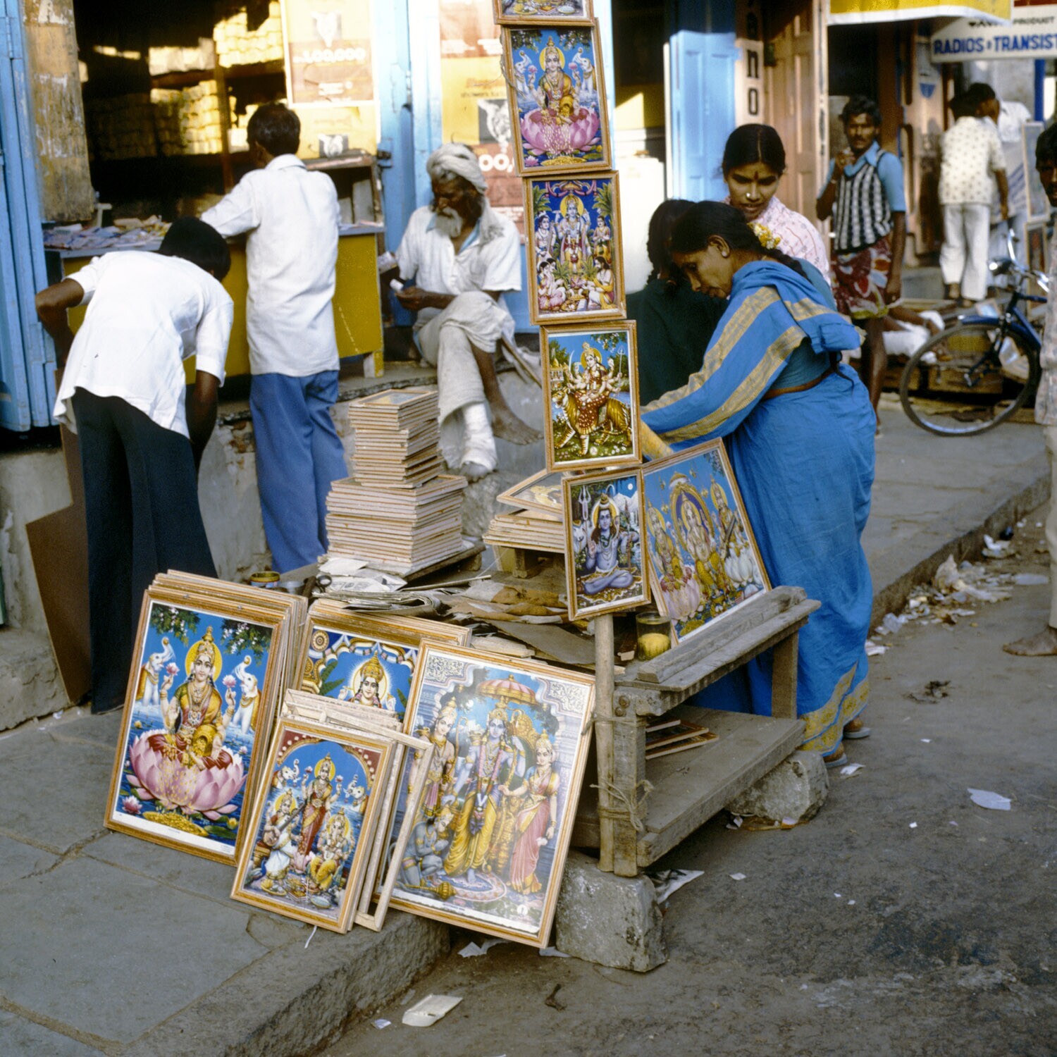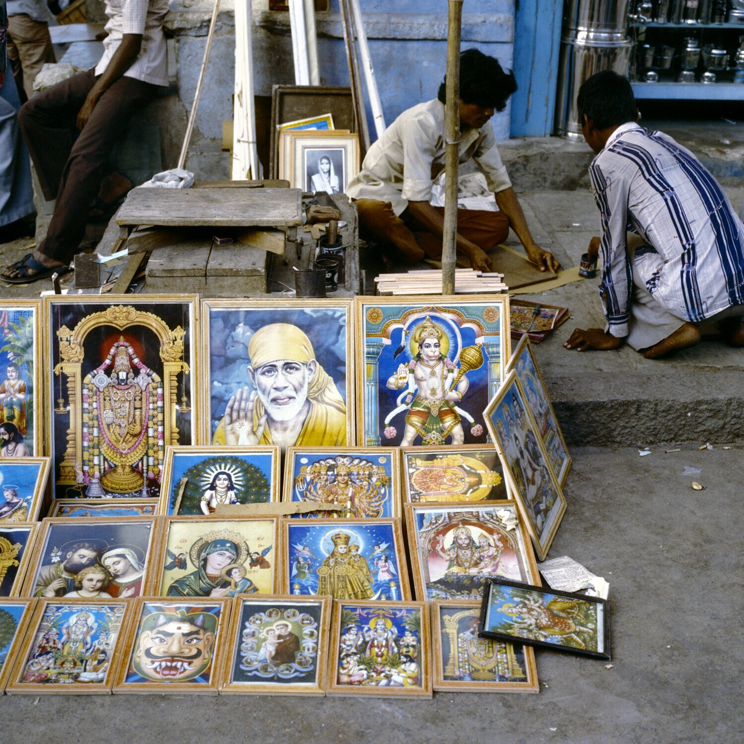 Verkoop van allerlei ingelijste godenprenten in de s...
