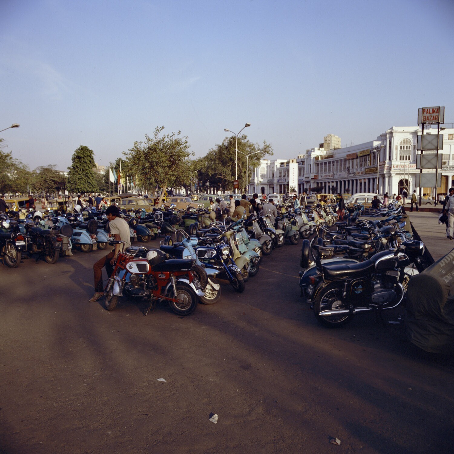 Een parkeerplaats met scooters en motoren op de Conn...