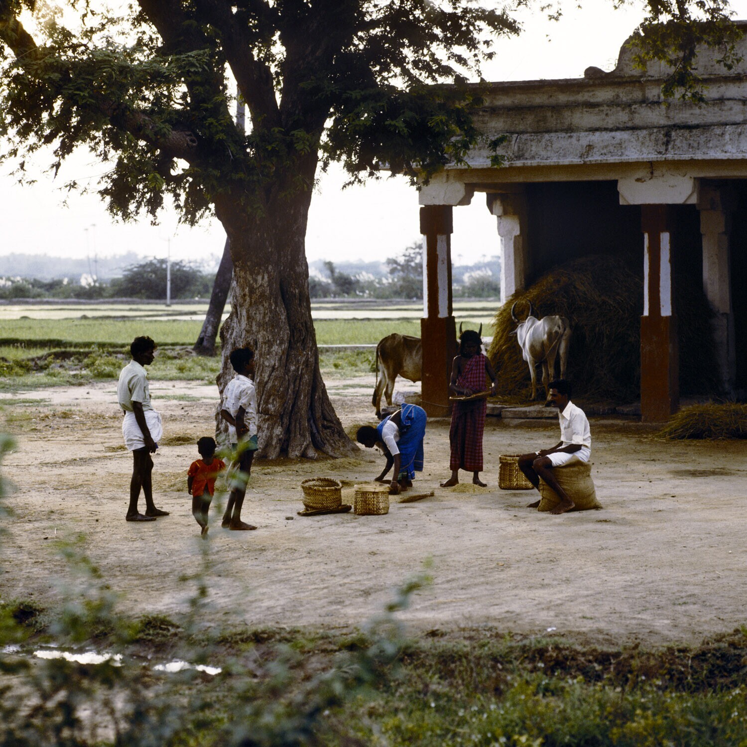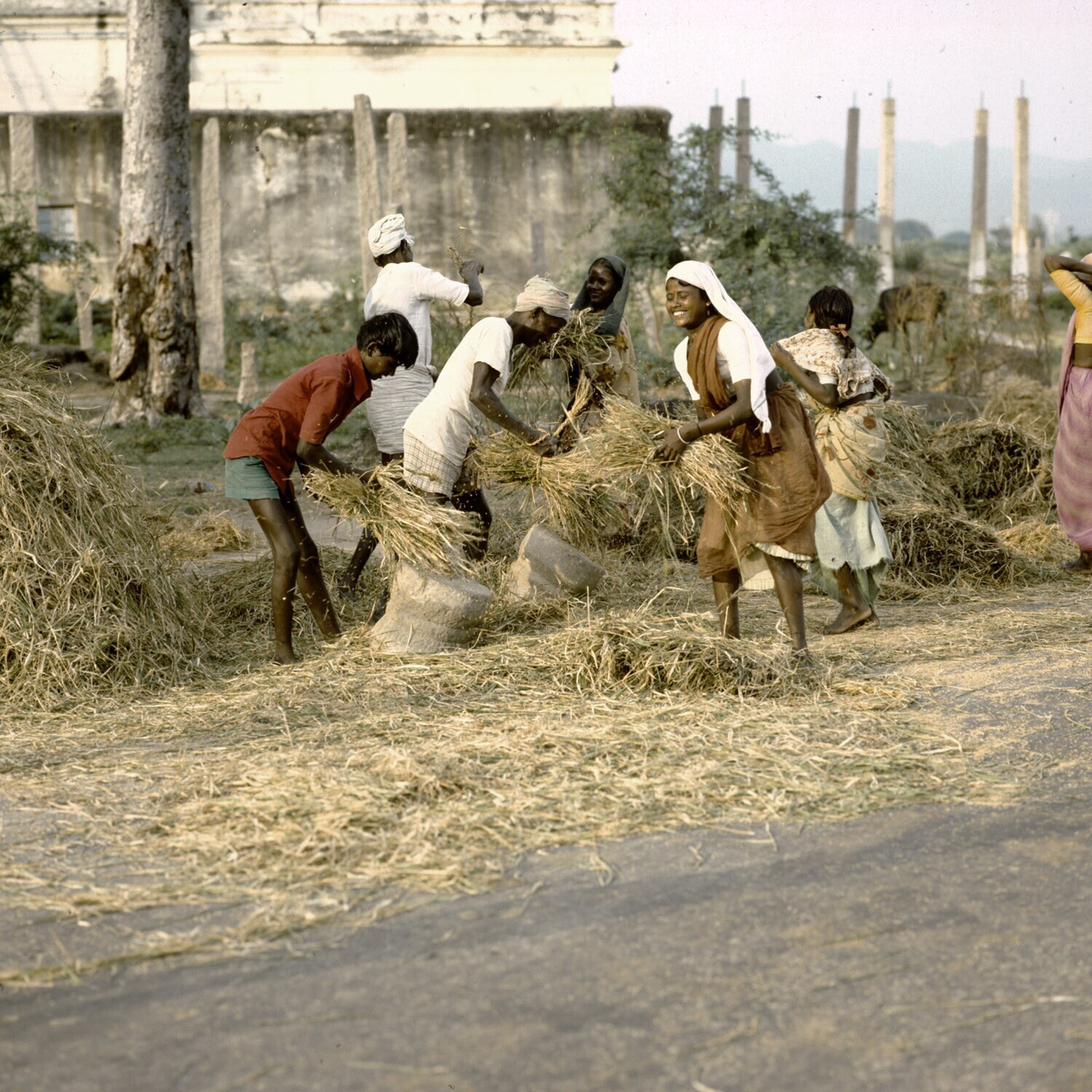 Het dorsen van rijst op een kleine boerderij in Madurai