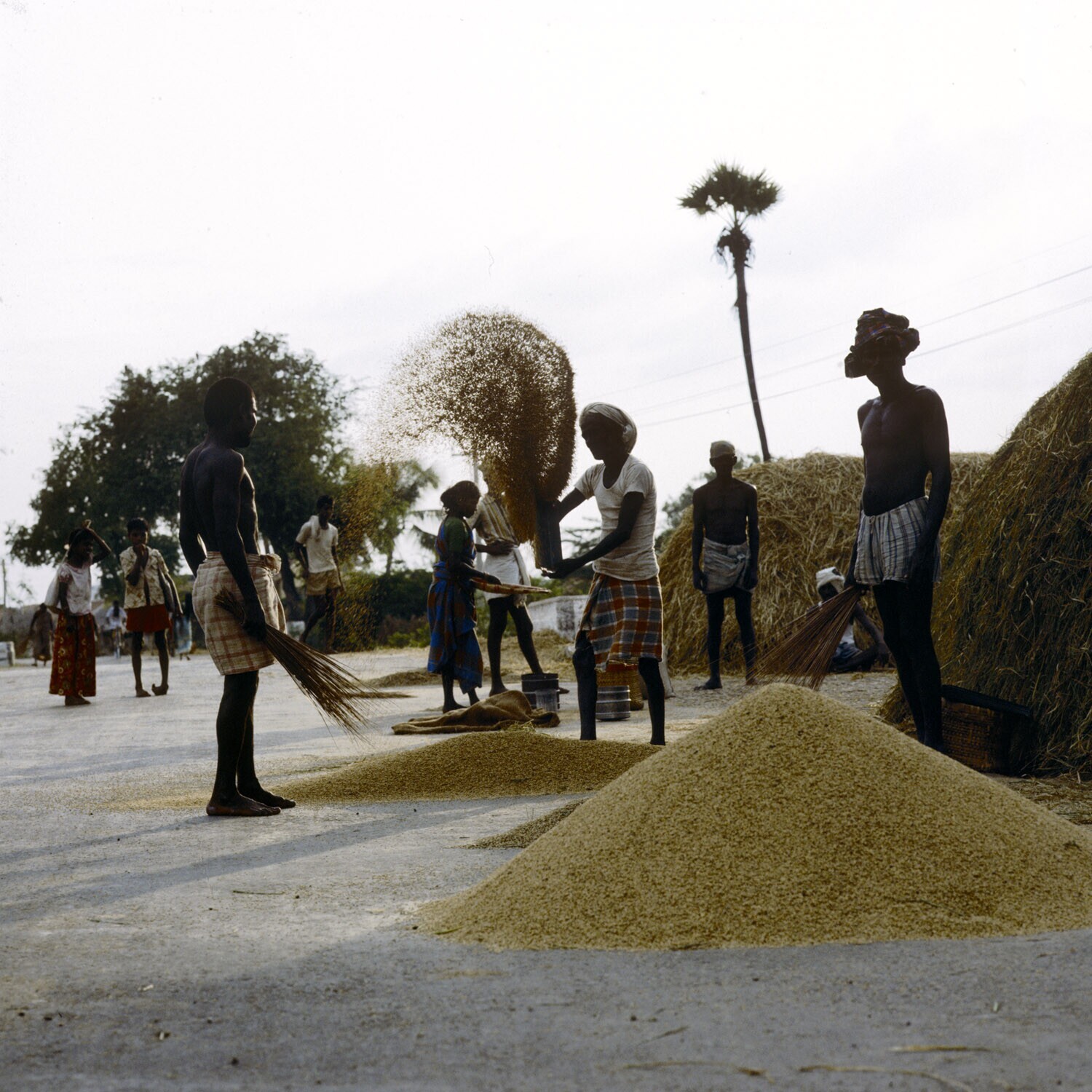 Het dorsen van rijst op de openbare weg en het wanne...