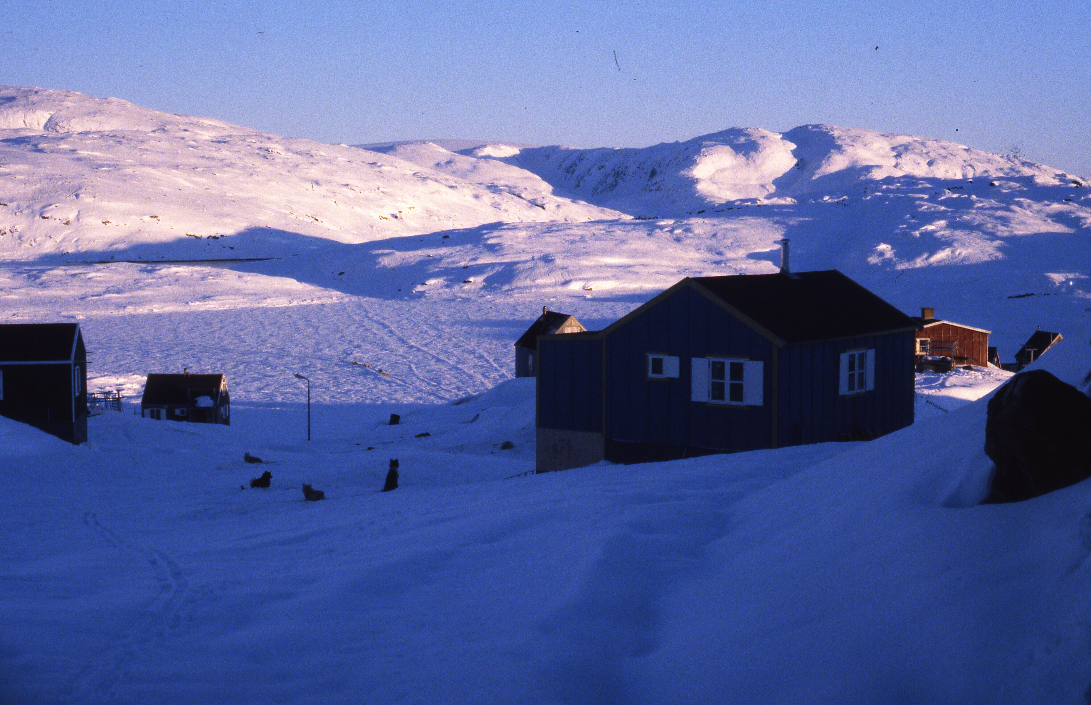 Huizen van Tniteqilaaq in de sneeuw, overdag, maart .