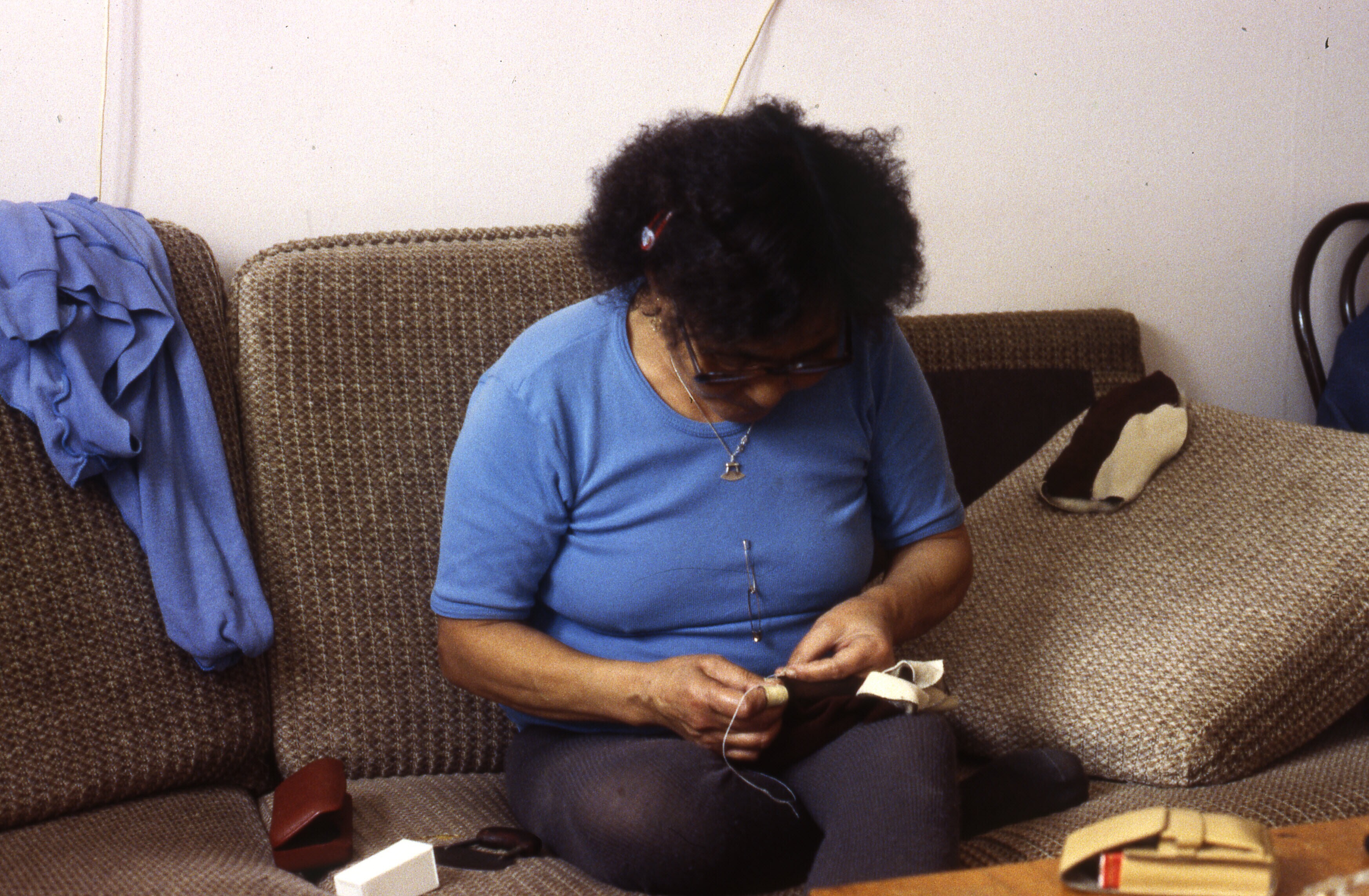 Asta Jonathansen is bezig om wanten te naaien van ge...