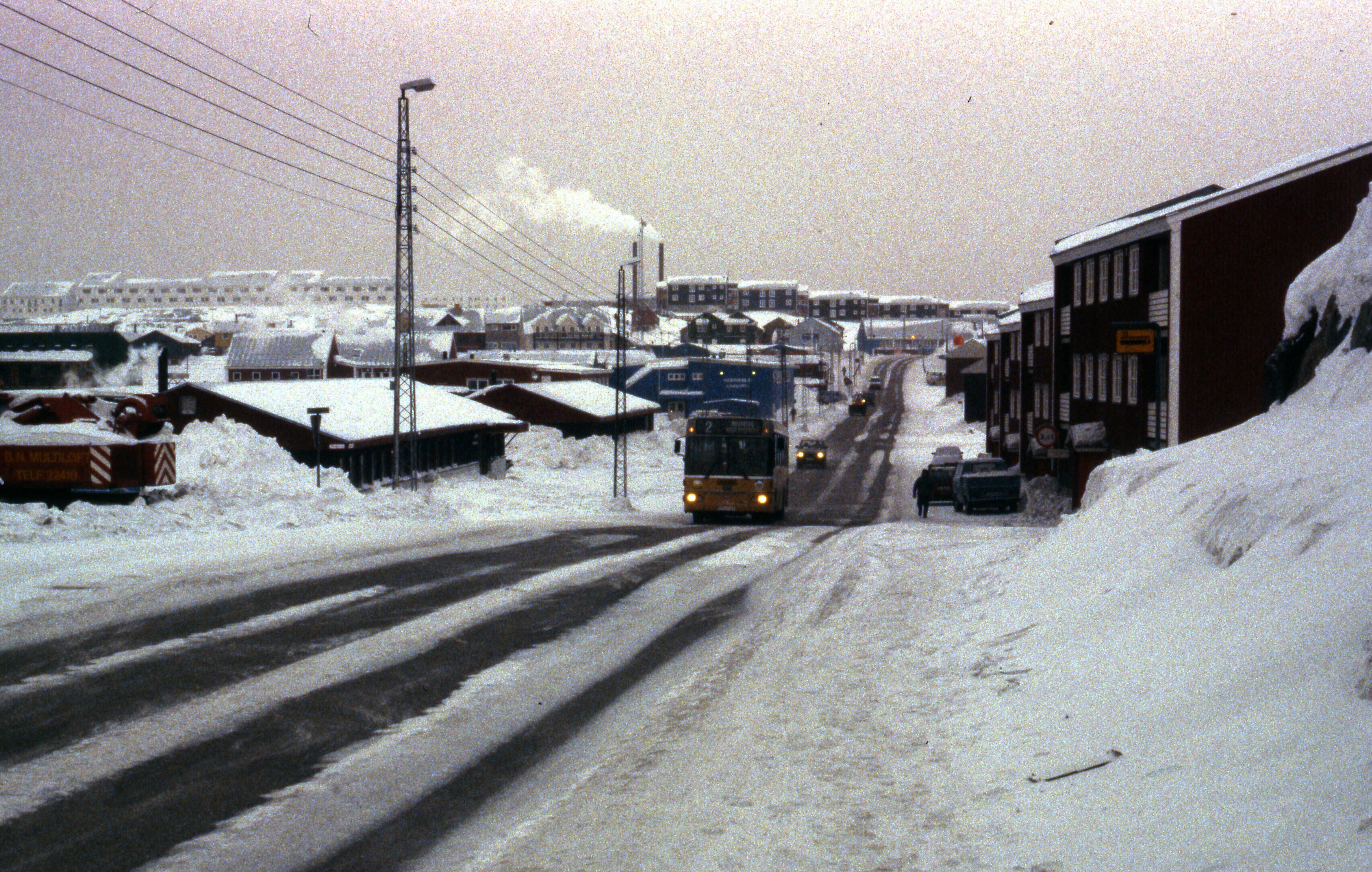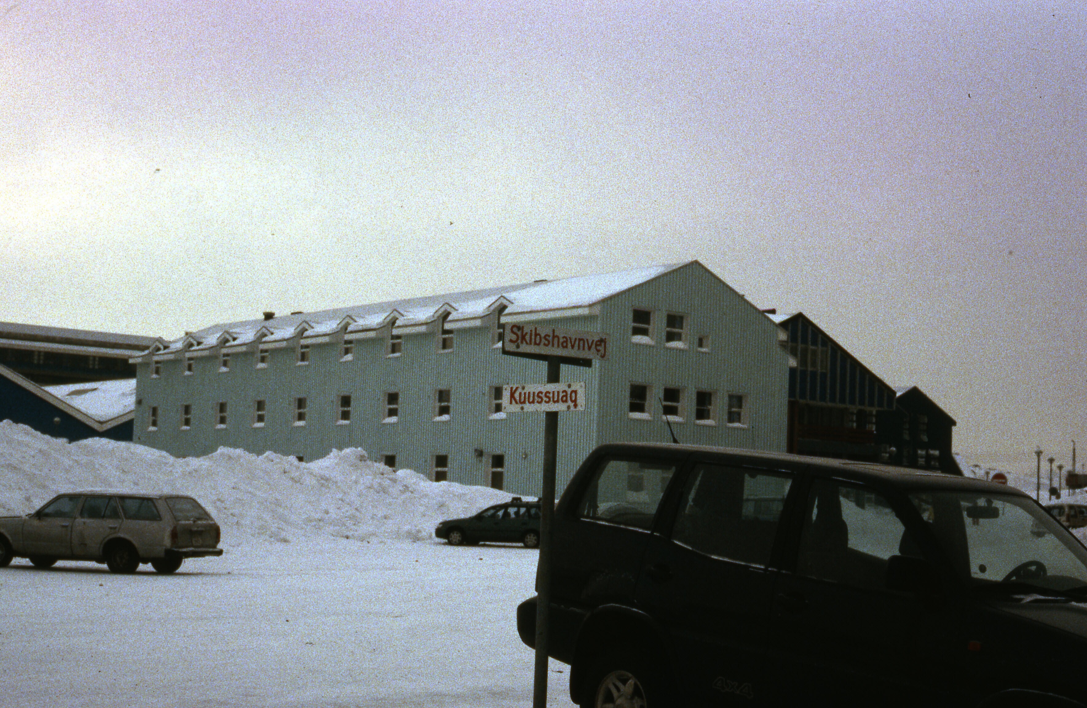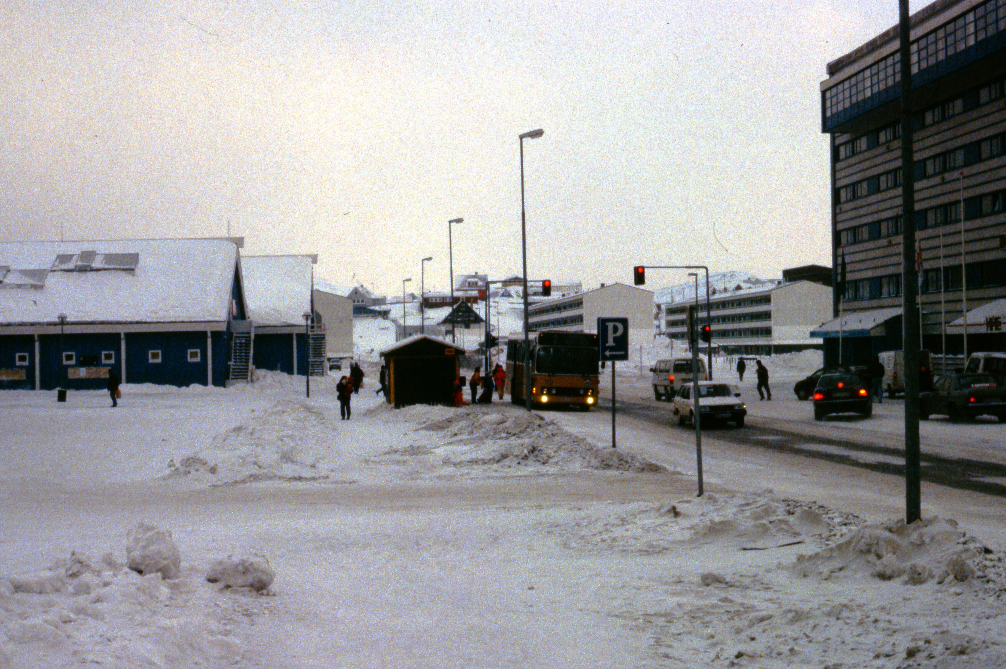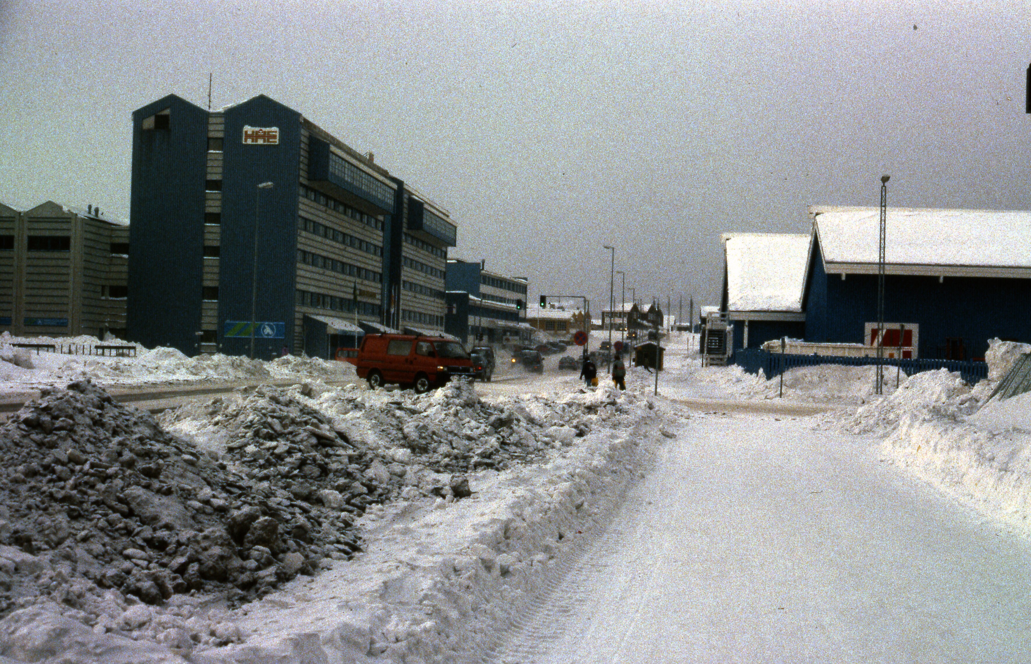 Besneeuwd straatbeeld van Nuuk, maart . Moderne gebo...