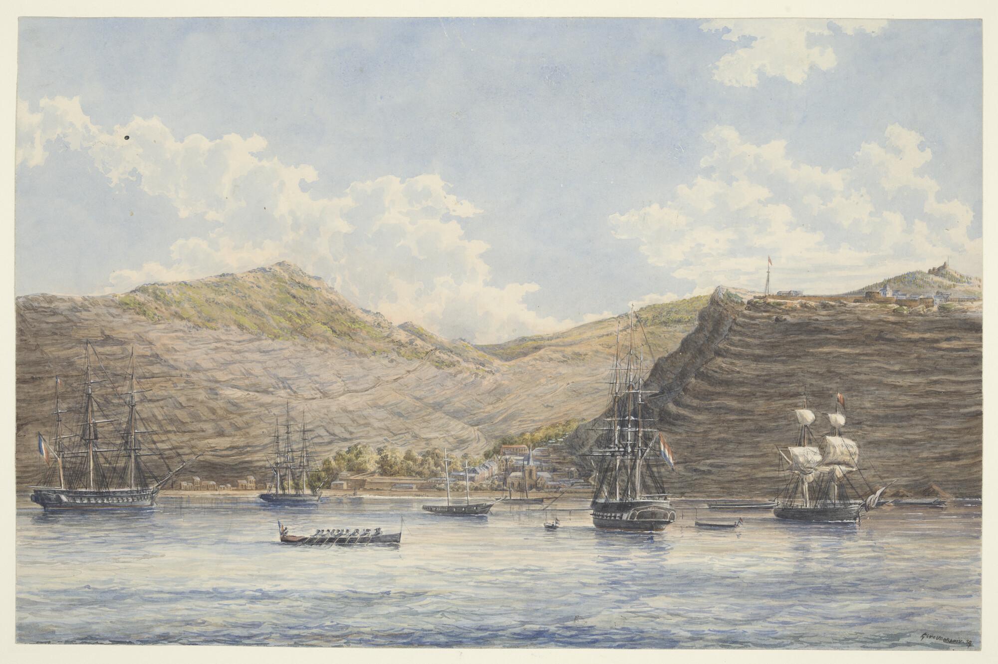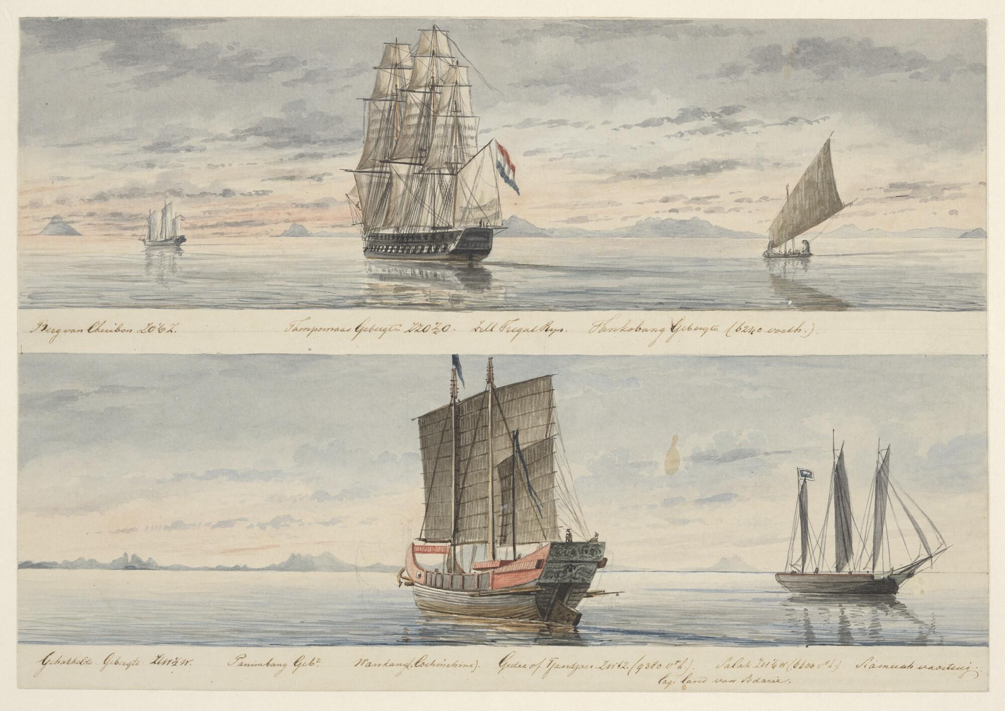 Het fregat Zr.Ms. 'Rijn' voor de kust van Noord Java