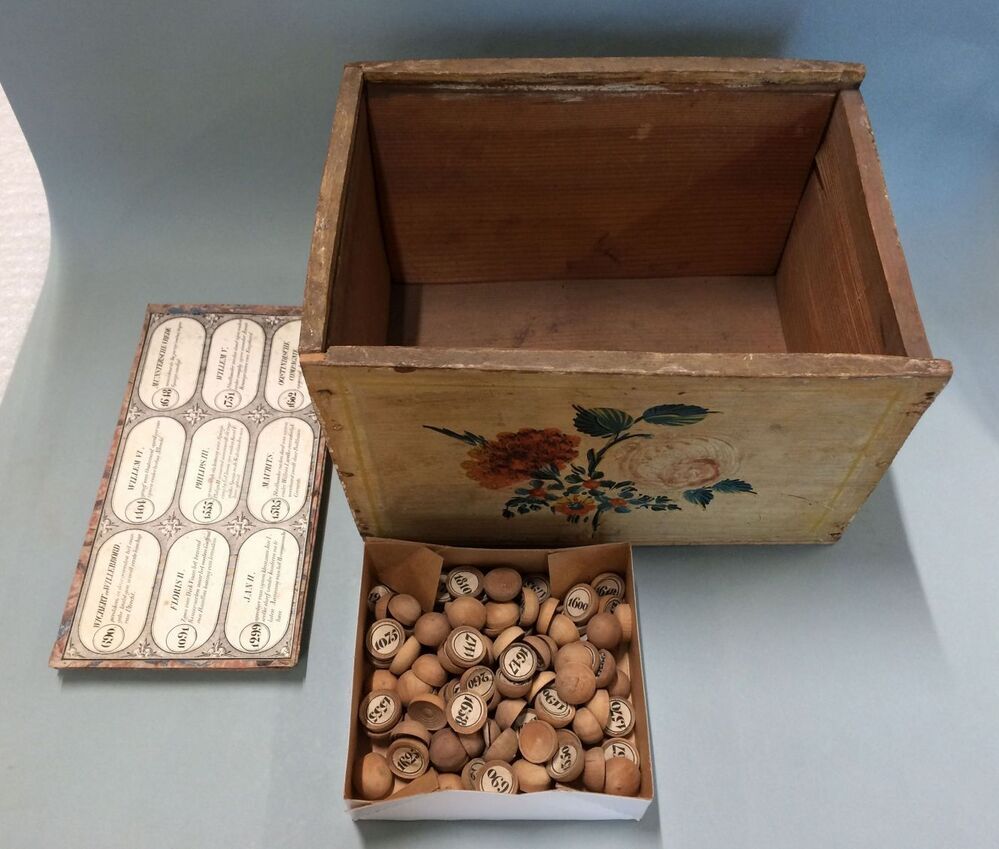 Lottospel in beschilderde doos waarin het jaartallen...