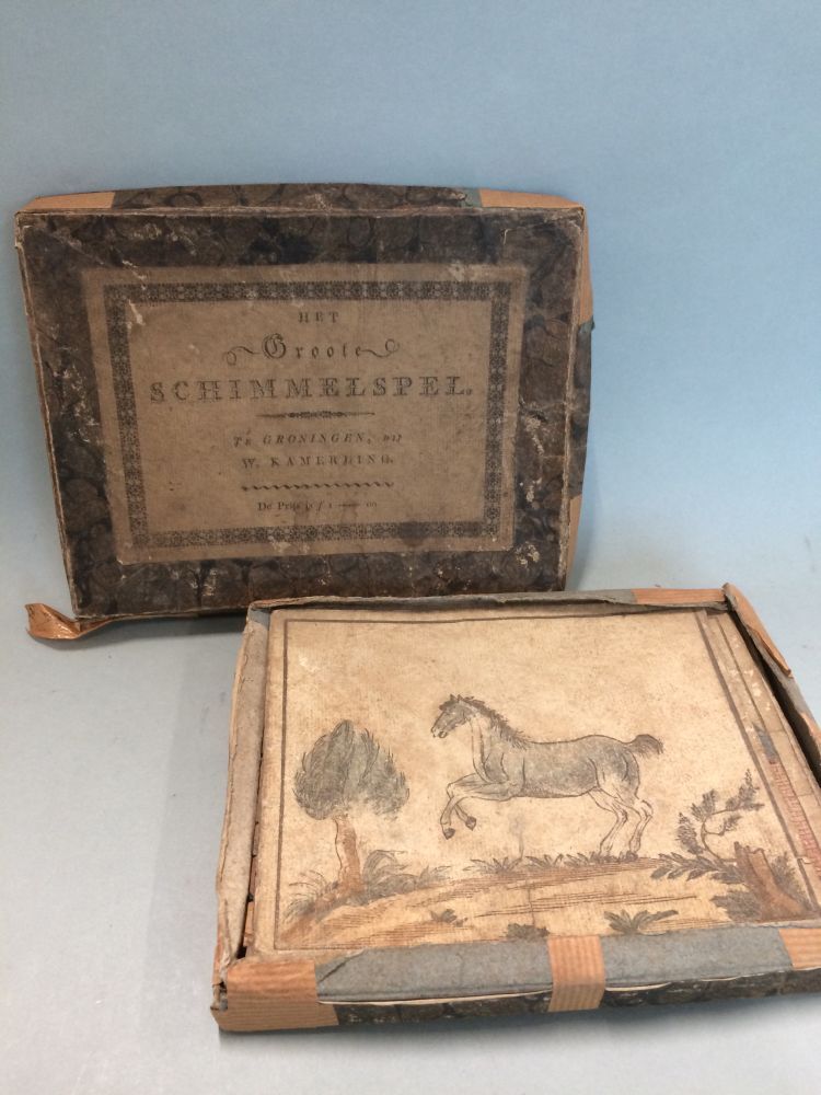 Blakje met vier fichesdozen waarop voorstellingen va...