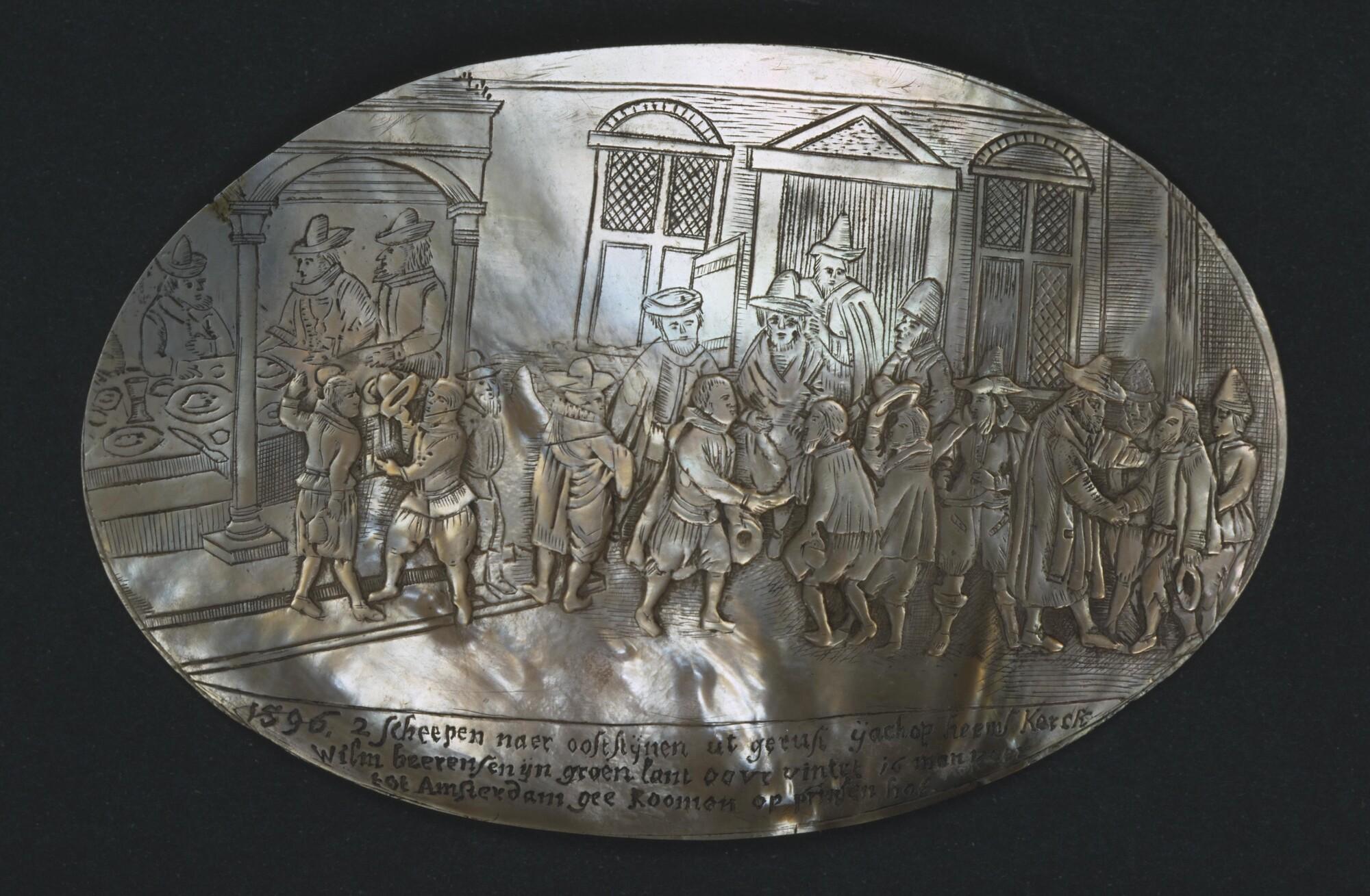 Snijwerk in schelp (parelmoer) met voorstelling van ...