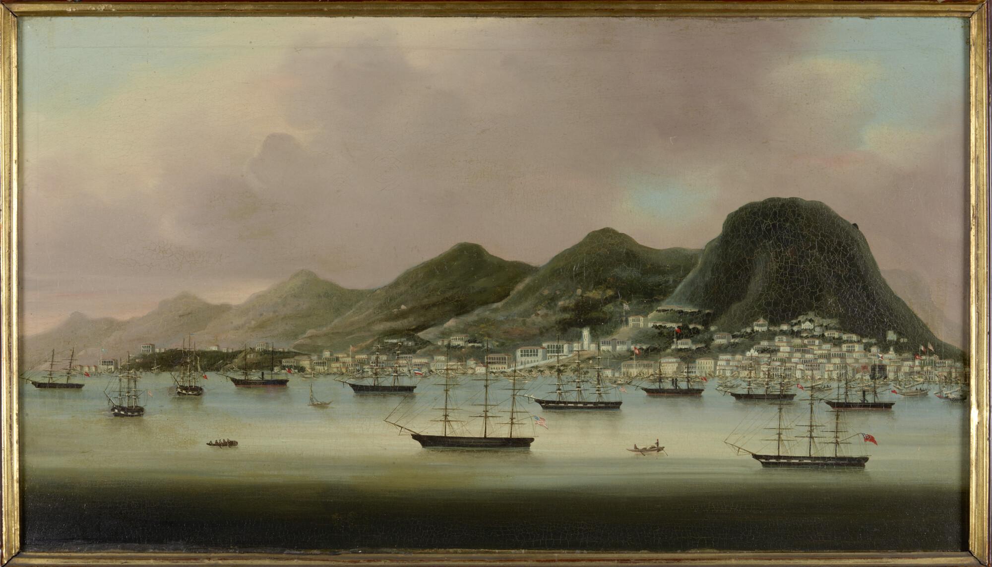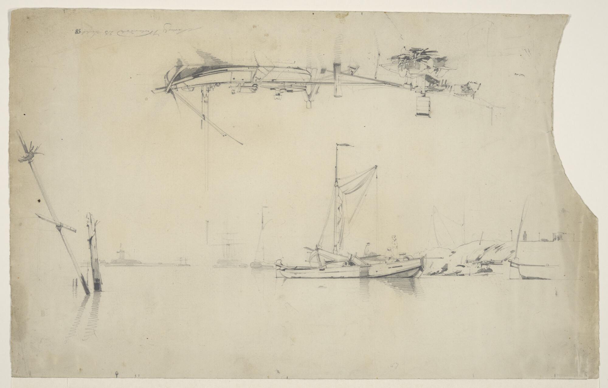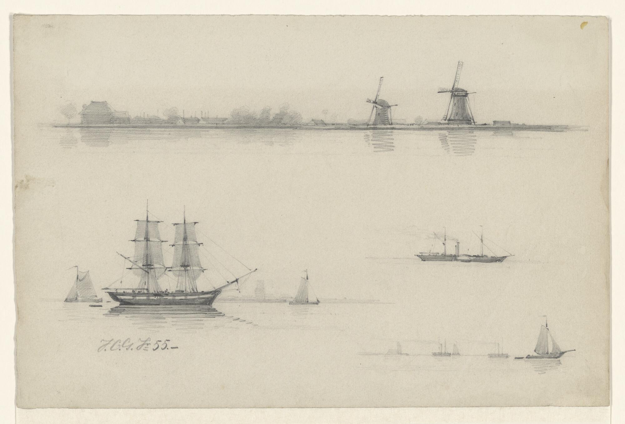 Gezicht op een rede met schepen
