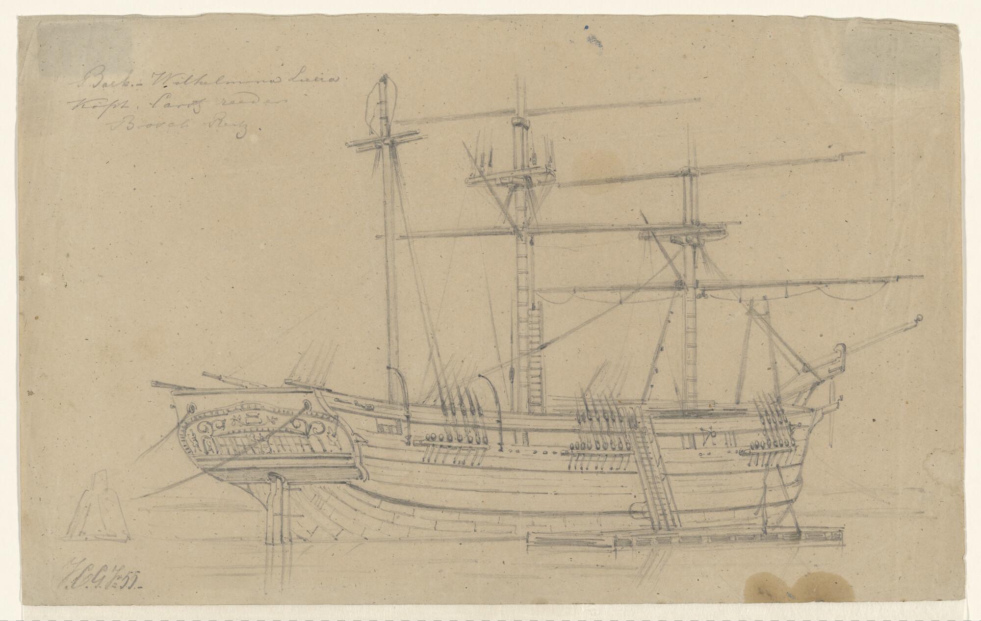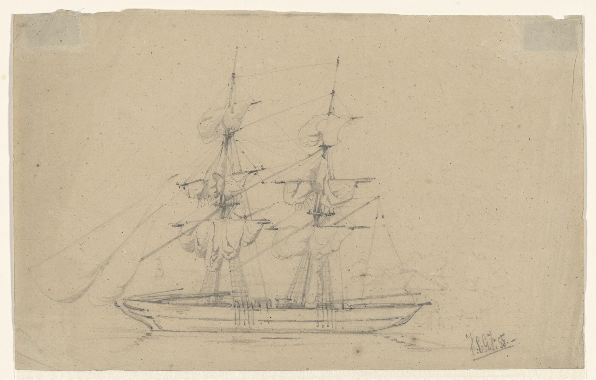 Een brikschip onder zeil, tuigonderdelen