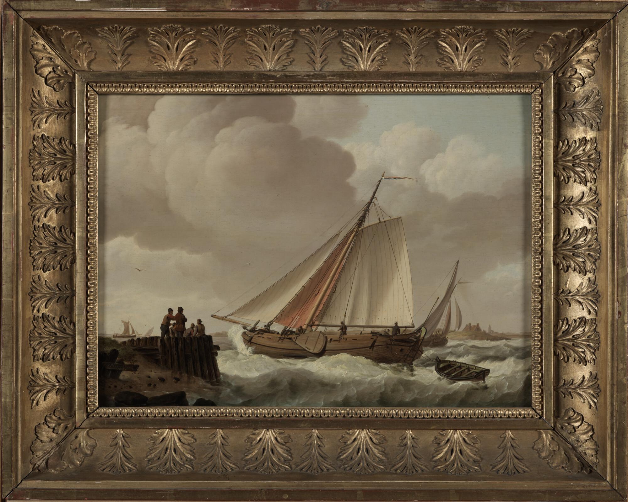 Nederlands pinasschip onder zeil nabij een rotsachti...