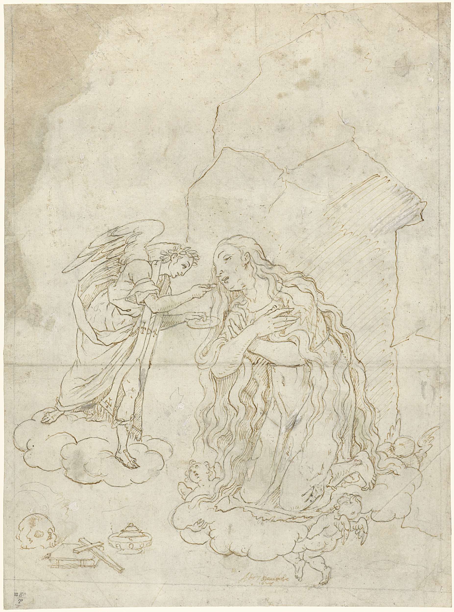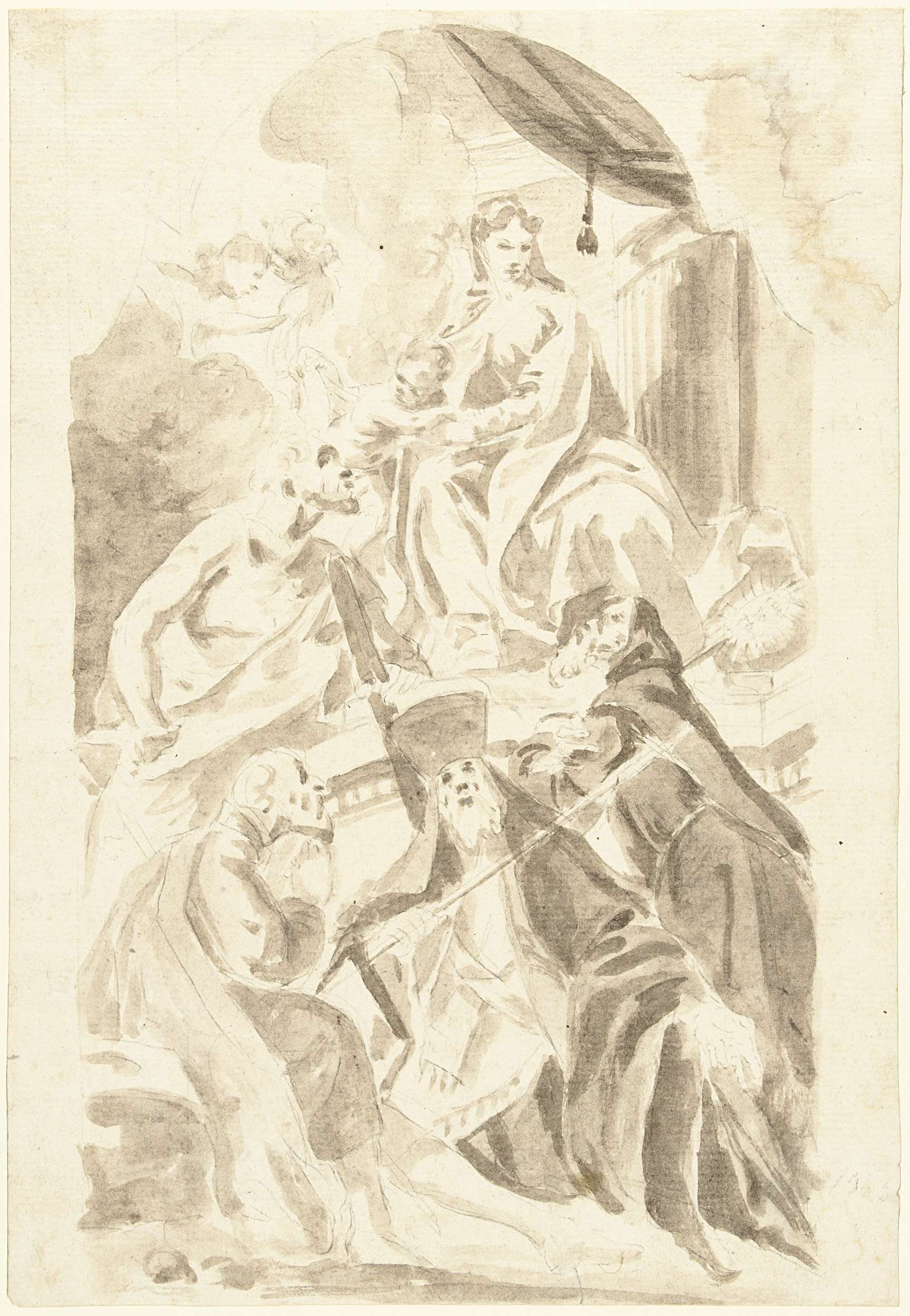 Maria met kind op een hoge troon, aan haar voeten ve...