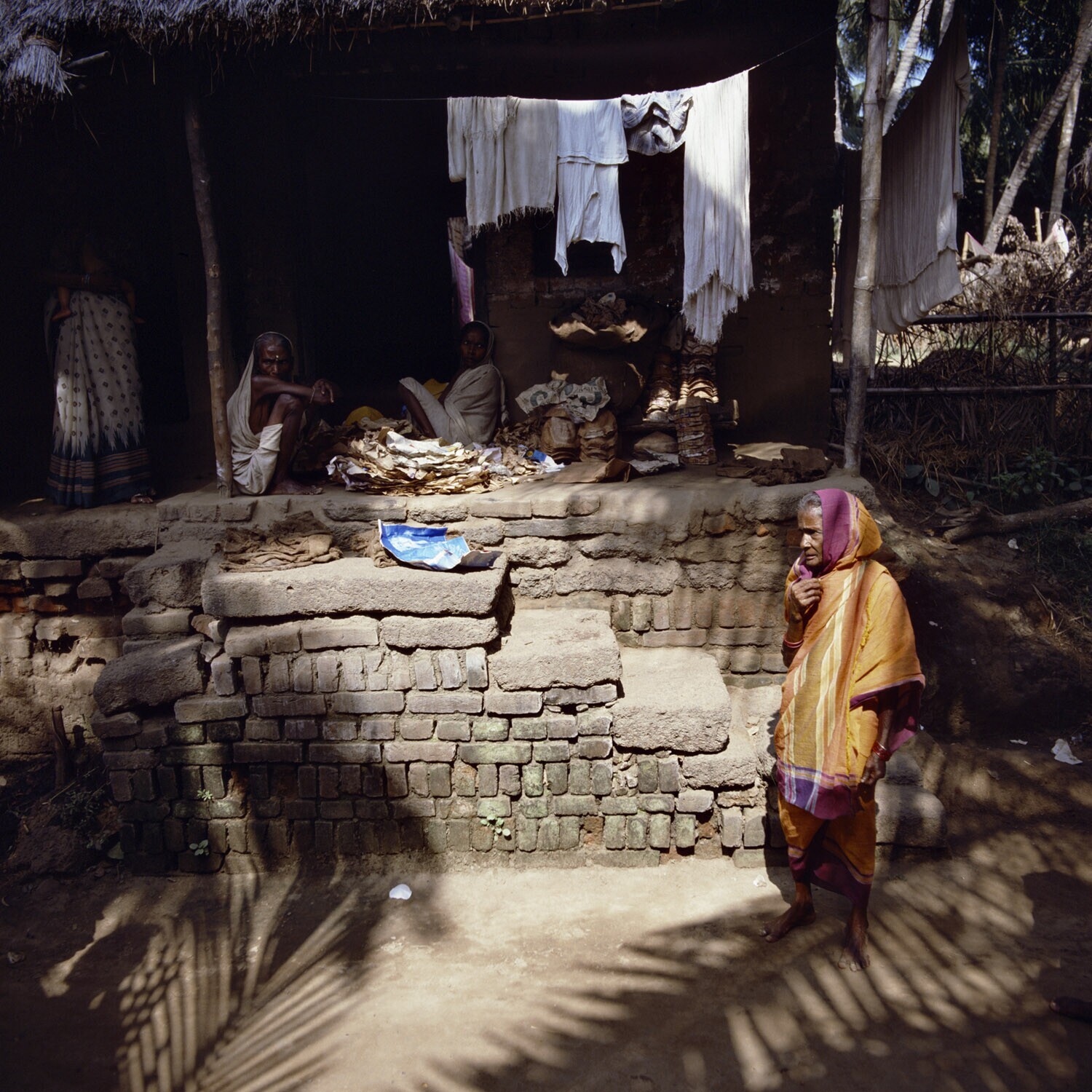 Een vrouw zittend voor haar woning in het dorp Pipli...