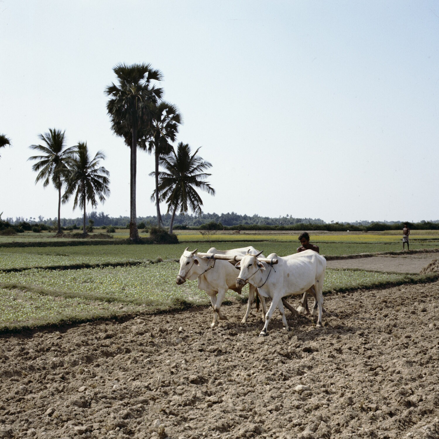 Een boer ploegt het land met een ossenspan en kinder...