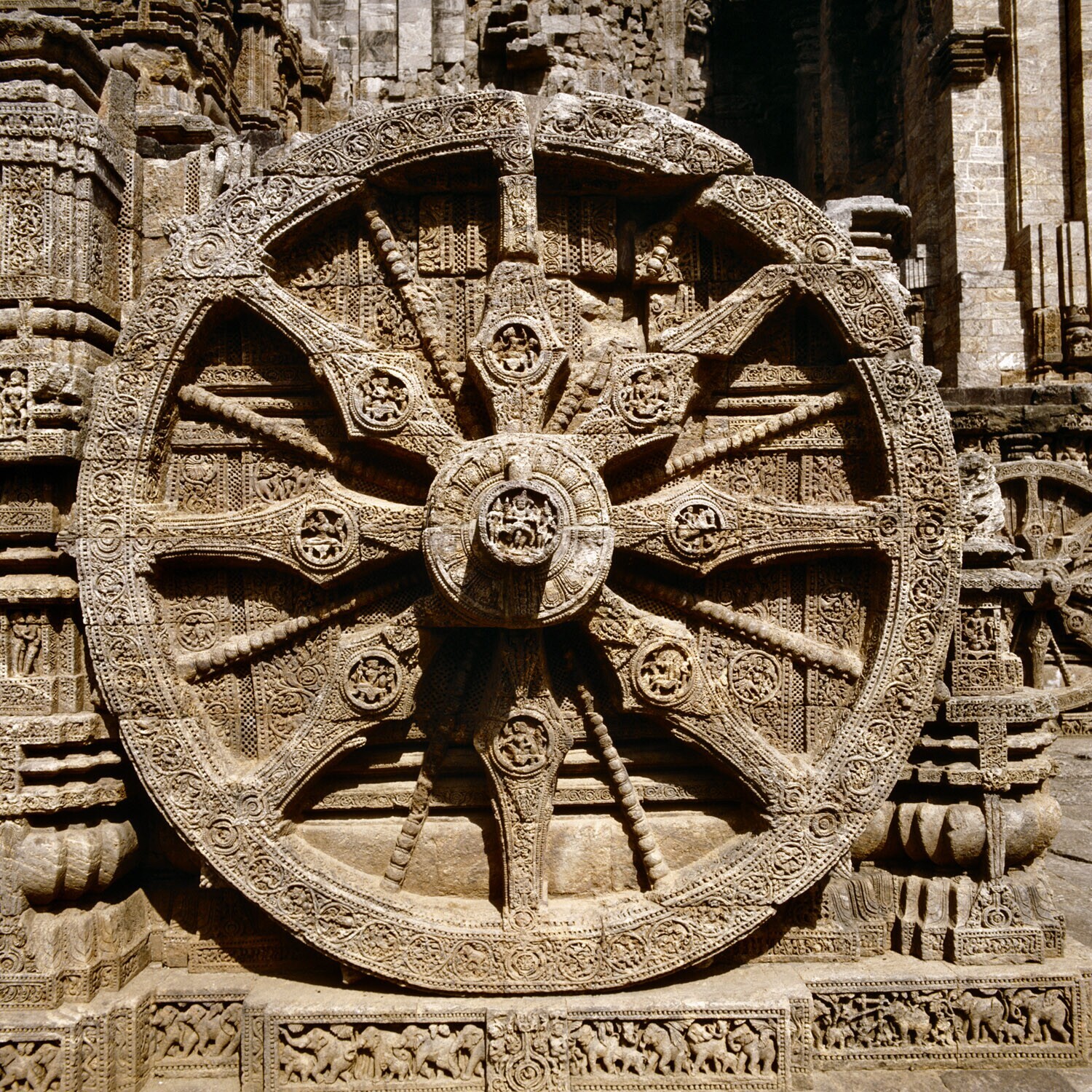 Close up van een wiel met figuurtjes als relidf van ...