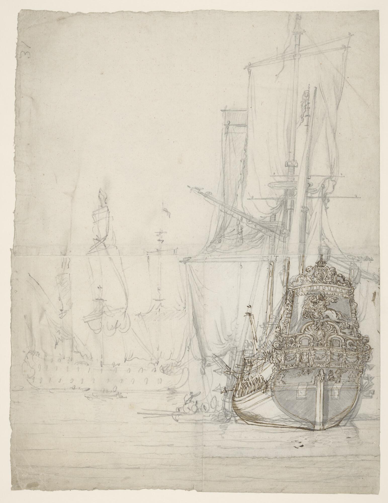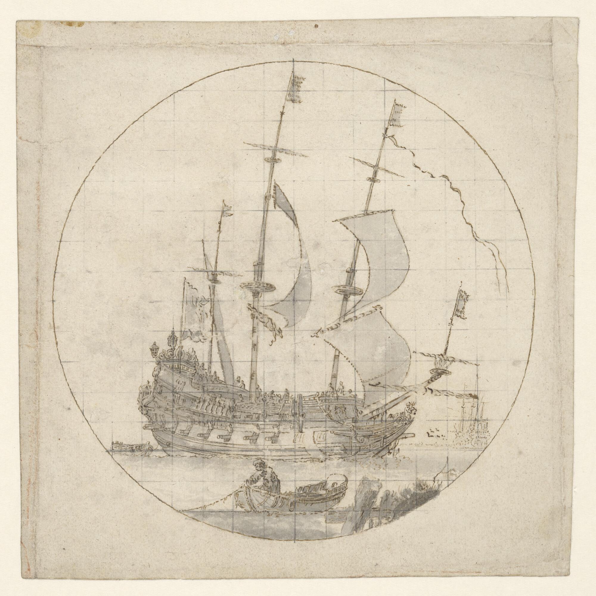 Een hektjalk en een linieschip op een rede