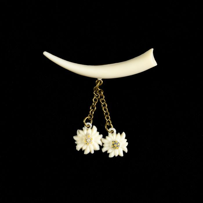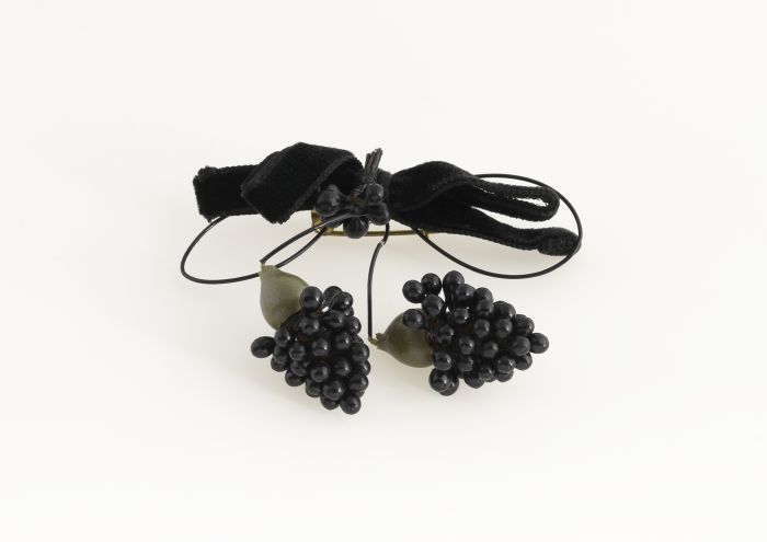 Broche, zwart strikje van fluweel met twee aanhangen...