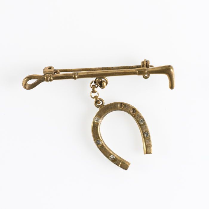 Koperkleurige broche, zweep, met hoefijzer waarin si...