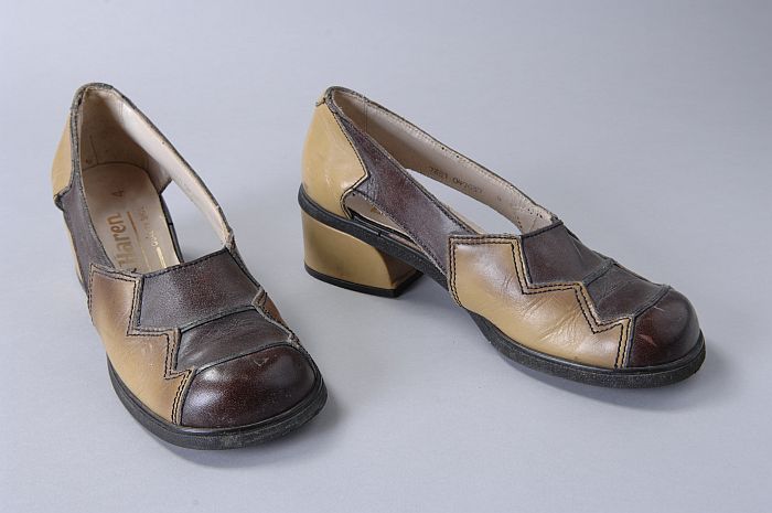 Gouden damesschoenen van goudbrokaat en goudleren T-...