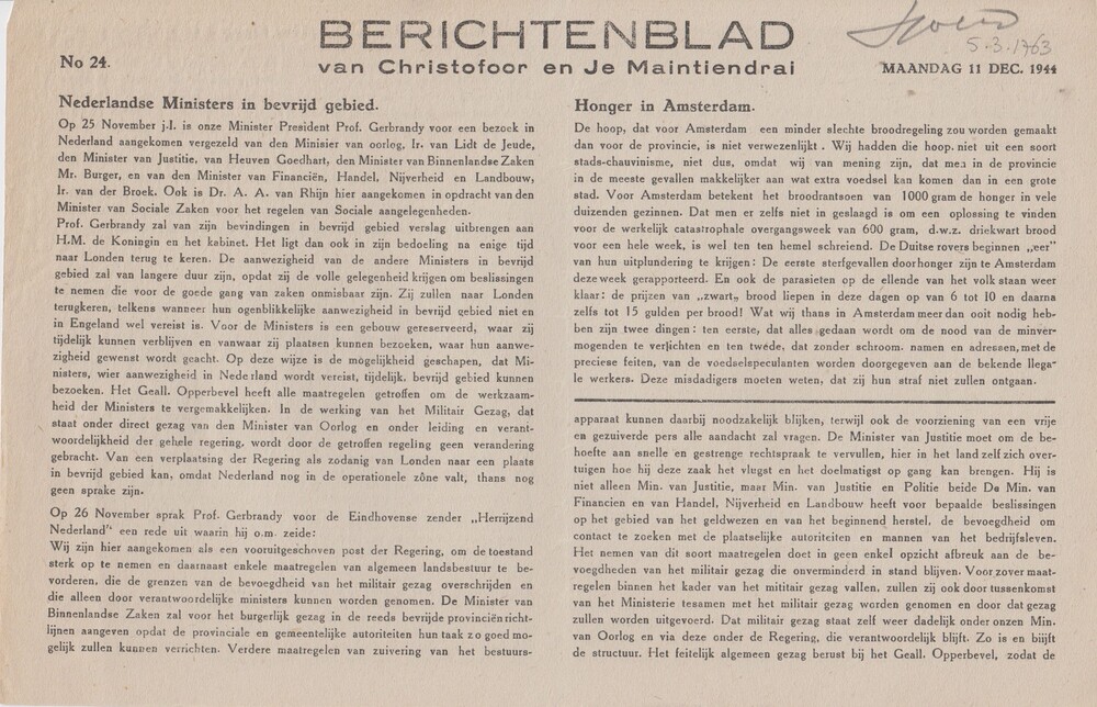 Berichtenblad vanChristofoor en Je Maintiendrai. No....