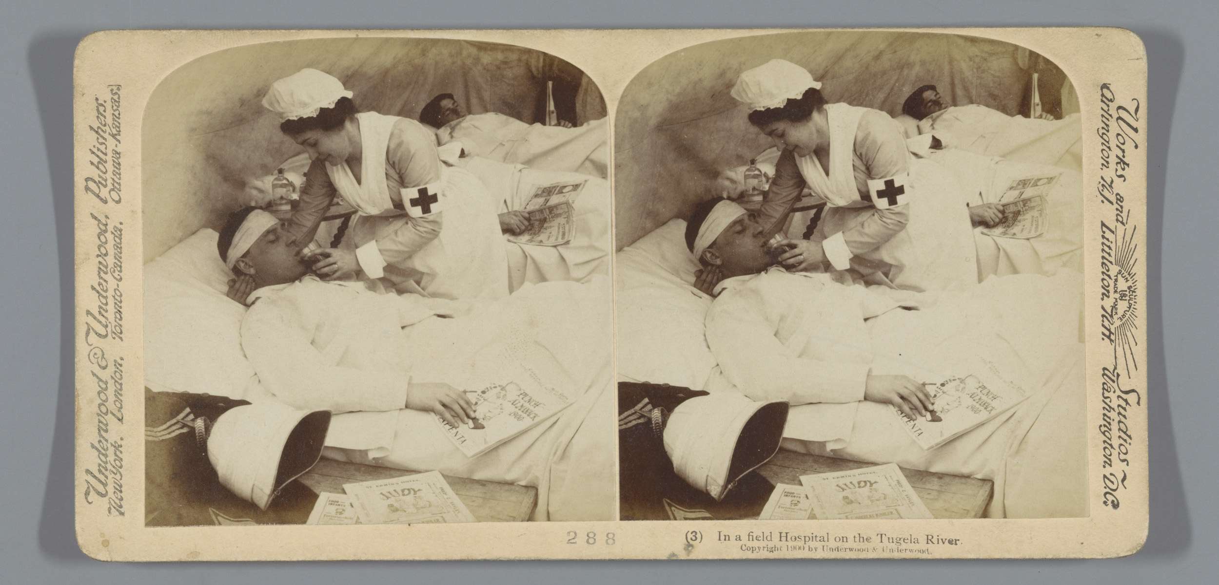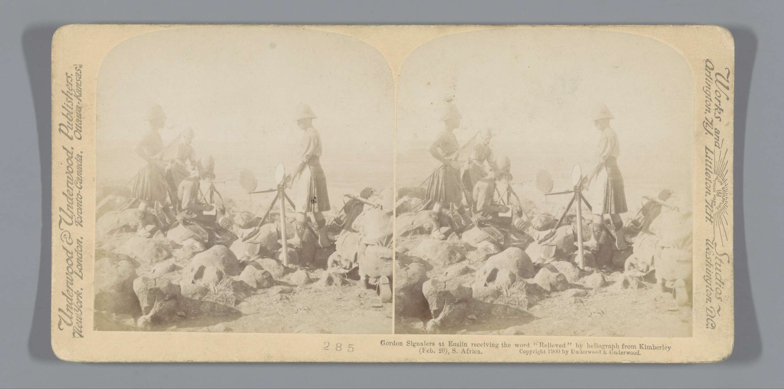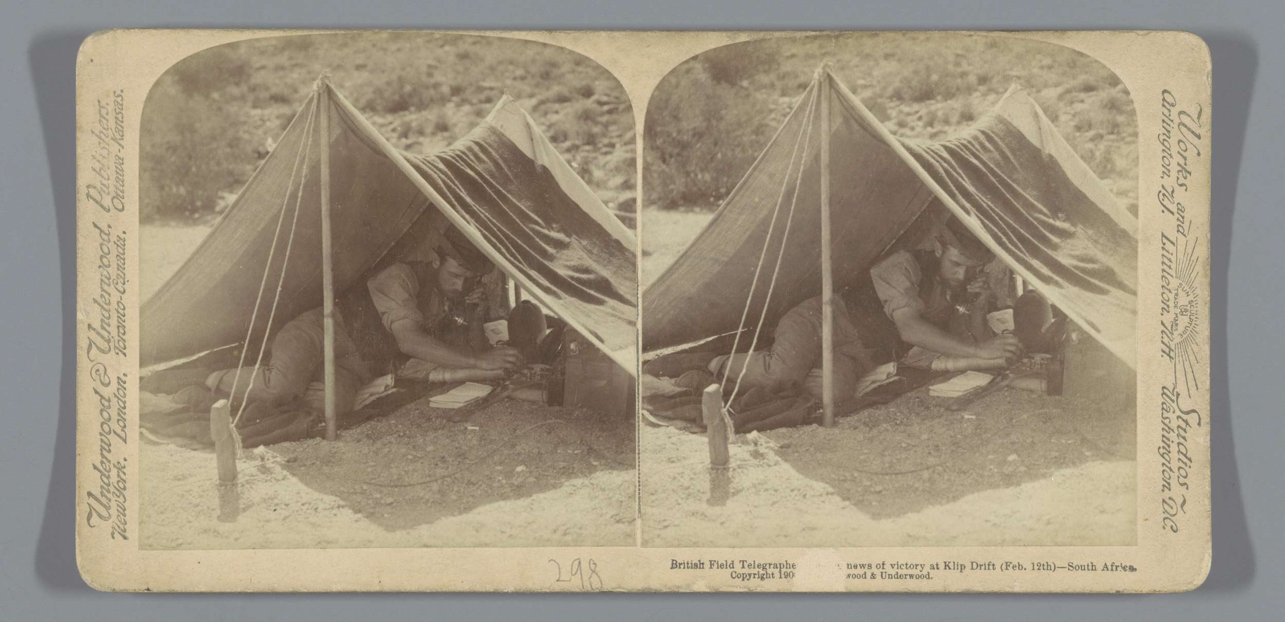 Vanuit een tent verstuurt een telegrafist een boodsc...