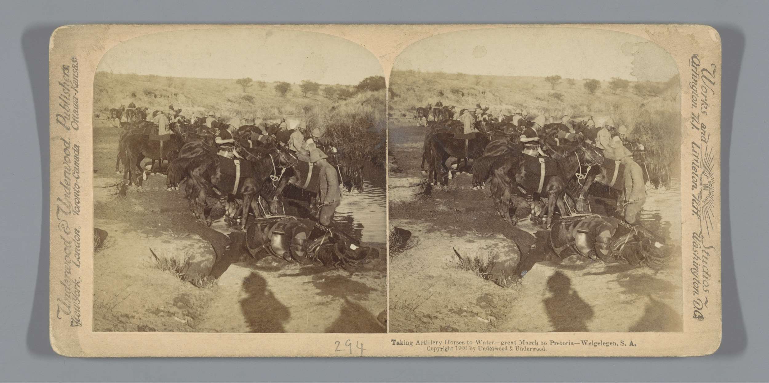 Militairen leiden hun paarden naar het water onderwe...