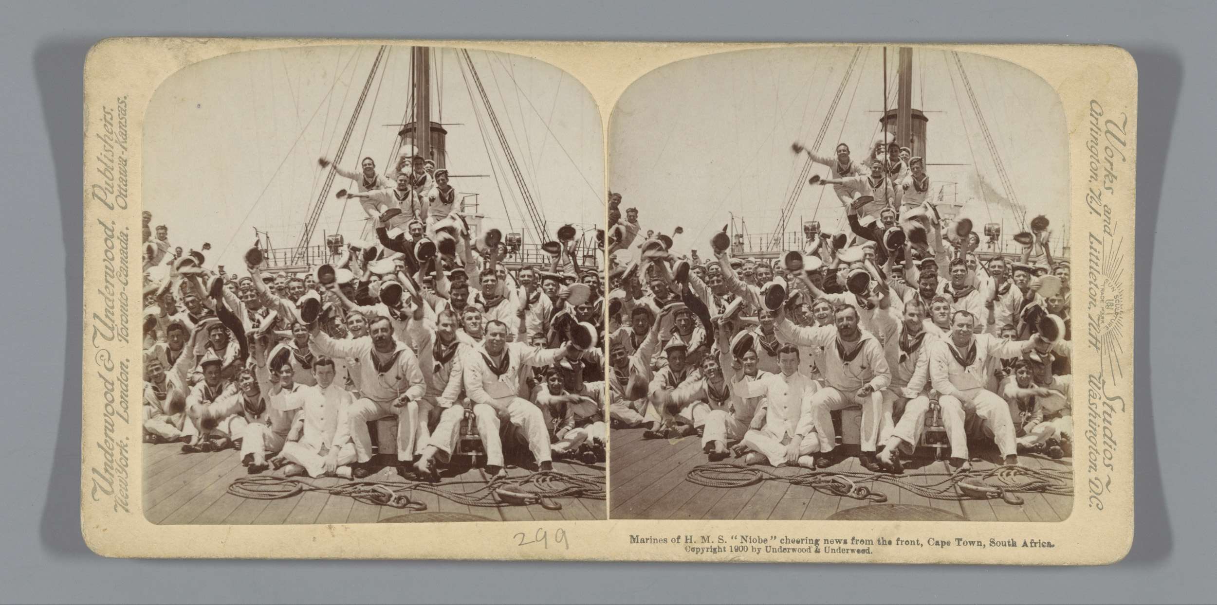 Britse mariniers op de HMS Niobe juichen om nieuws v...