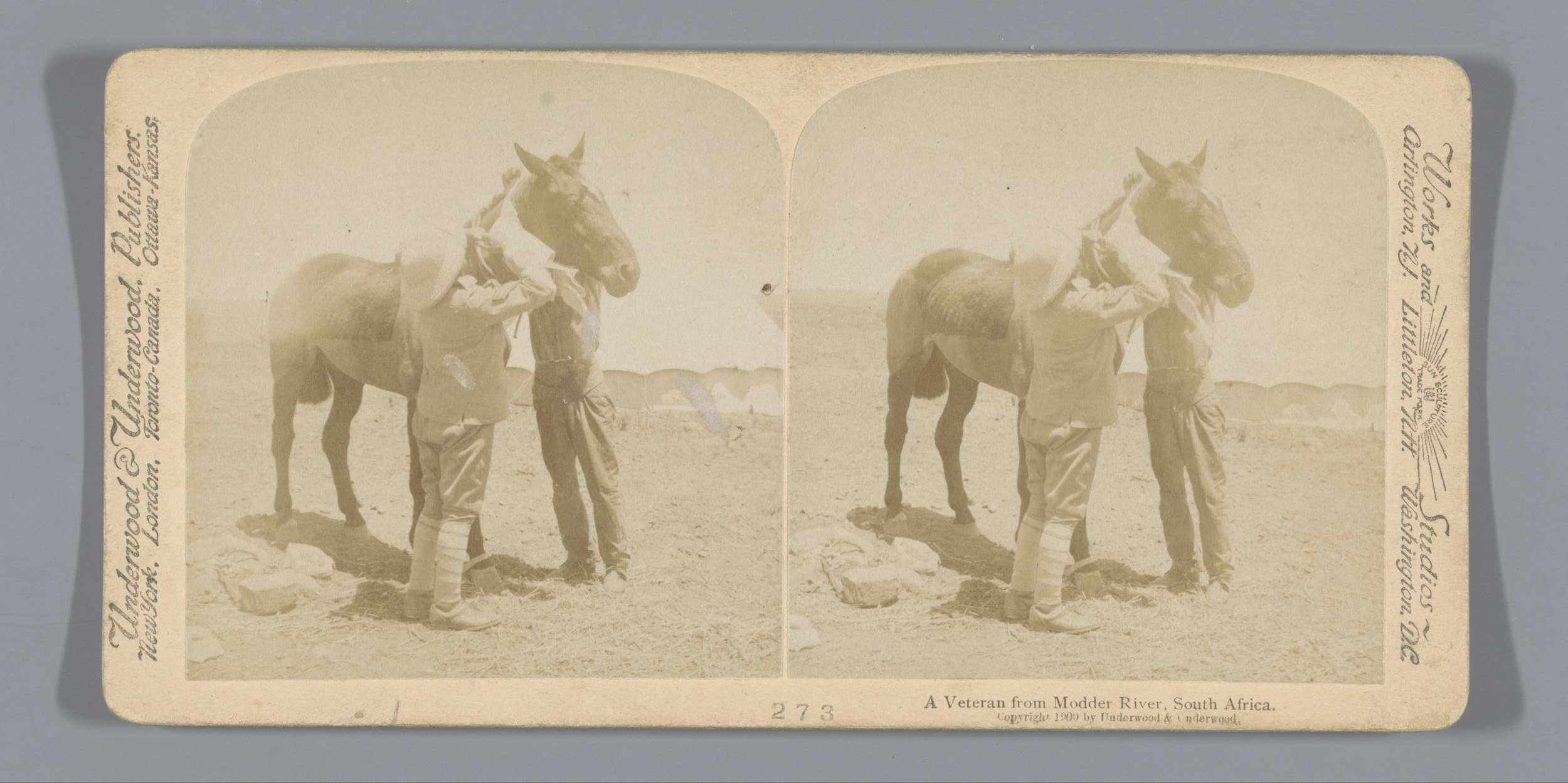 Twee mannen verzorgen een paard na een gevecht bij M...