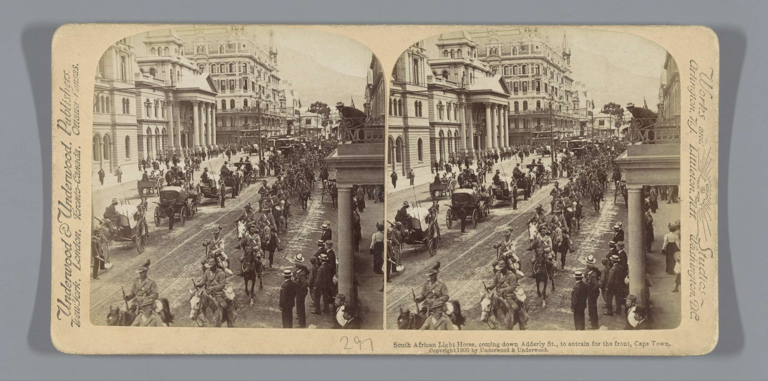 Troepen rijden door Adderly Street, Kaapstad, op weg...