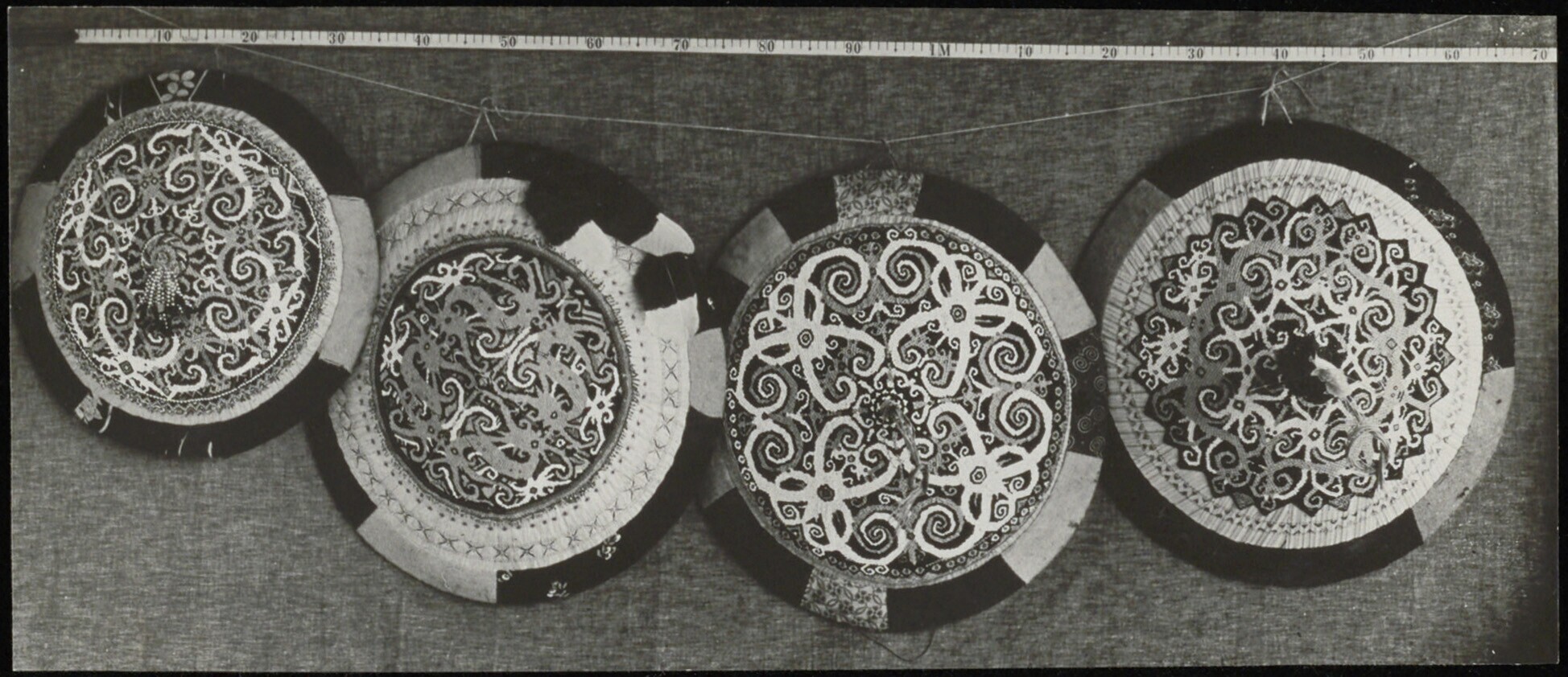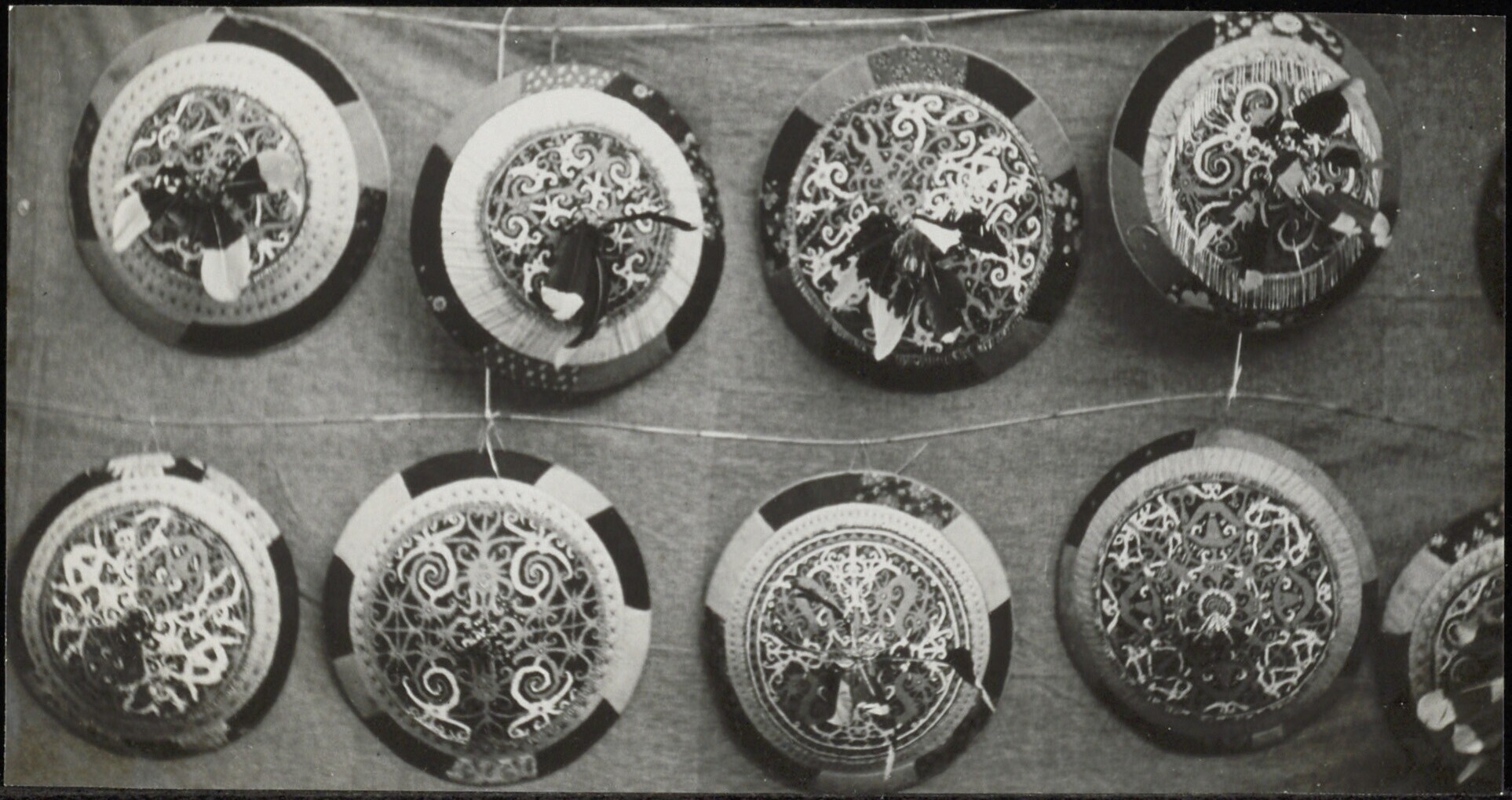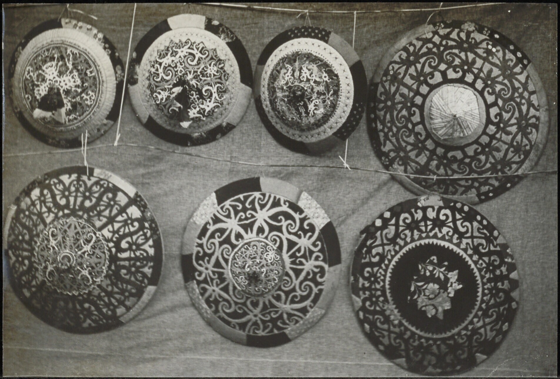 Ronde zonnehoed waarvan de buitenste rand versierd i...