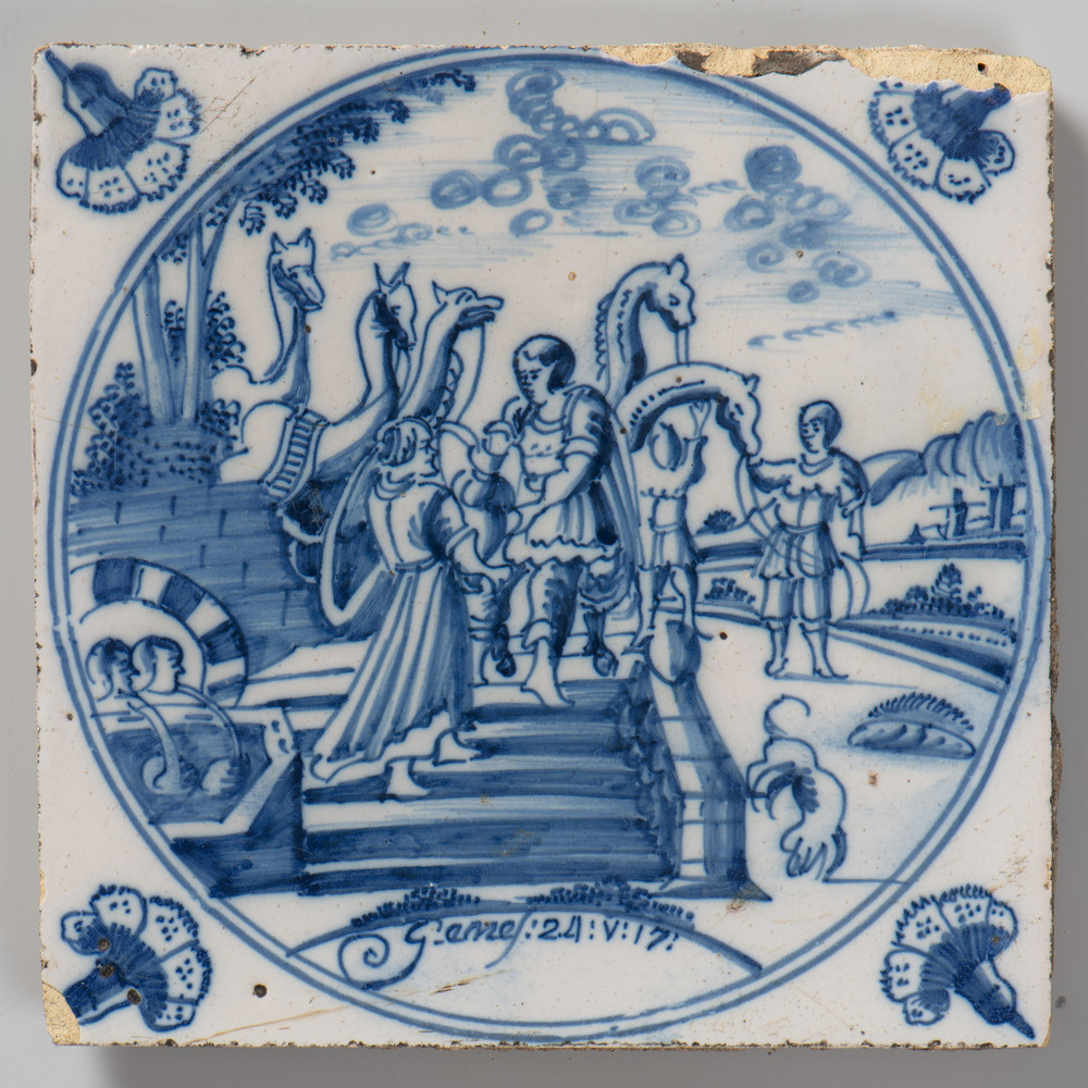 tegel van aardewerk met tinglazuur, voorstellende or...