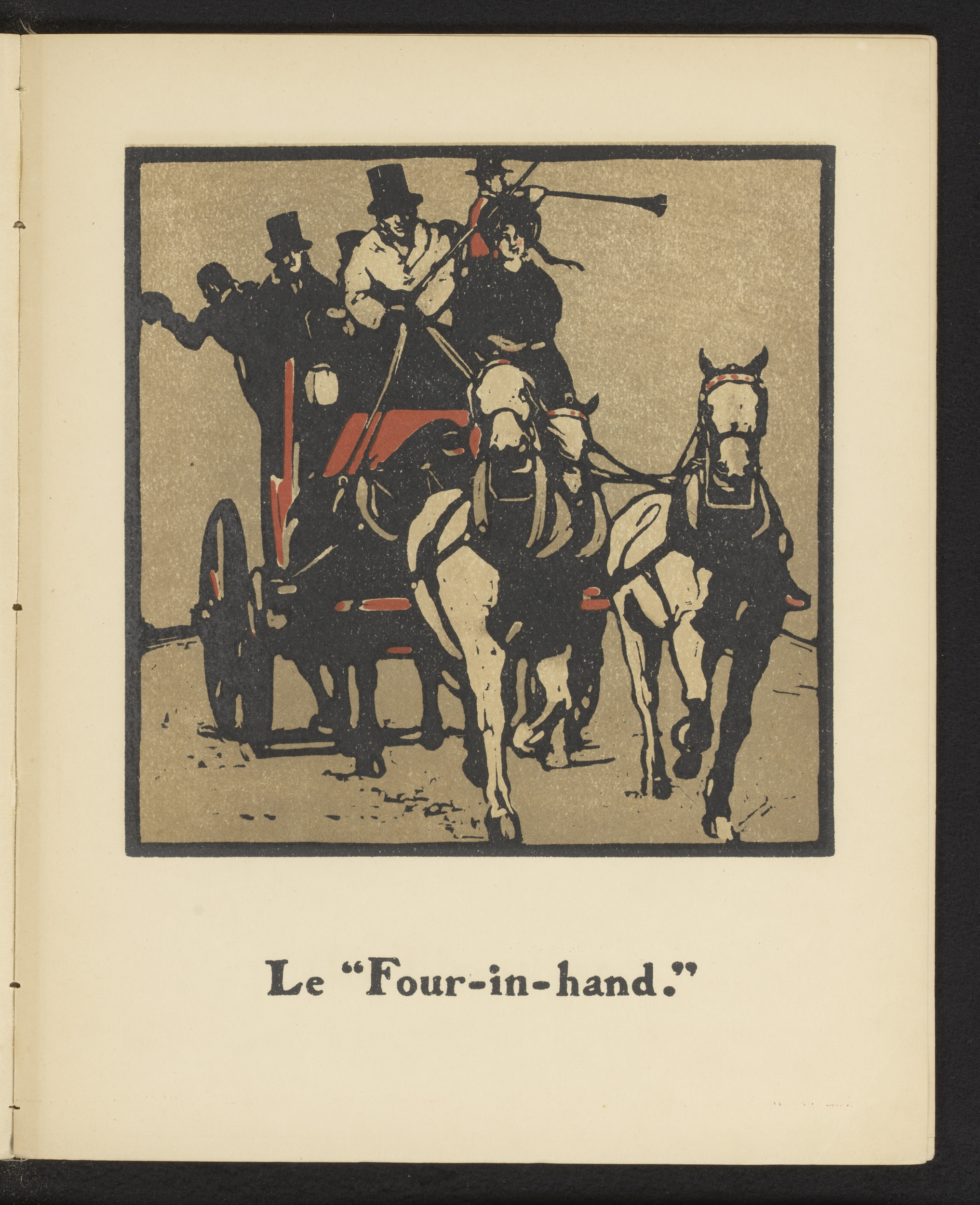 Paard en wagen met koetsier en hoornblazer
