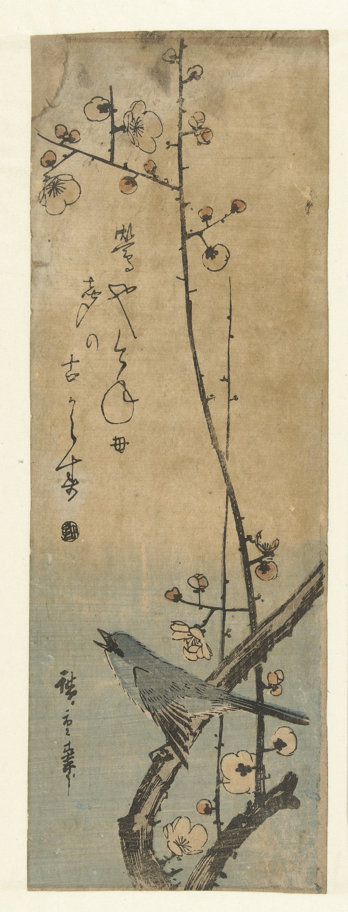 Japanse struikzanger op pruimentak, met haiku