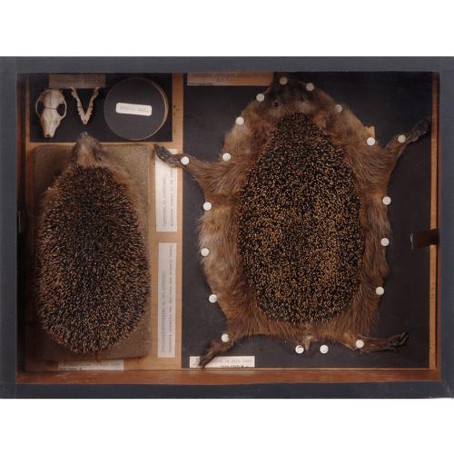 Opgezet zoogdier, balg, en schedel: Egel