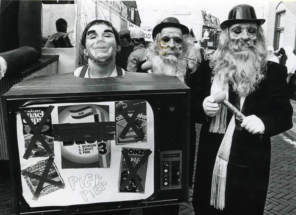 Zwart-wit foto van een carnavalsoptocht te Lobith in...
