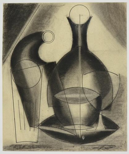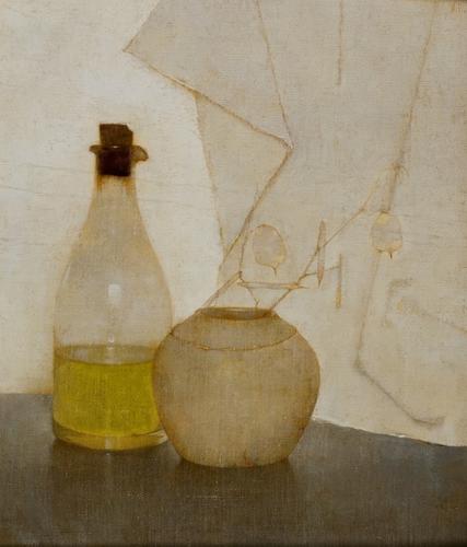 Stilleven met olieflesje en gemberpot met takje Juda...
