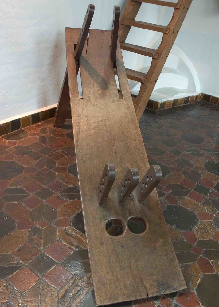 Pijnbank van eiken- en naaldhout en ijzer, gedeeltel...